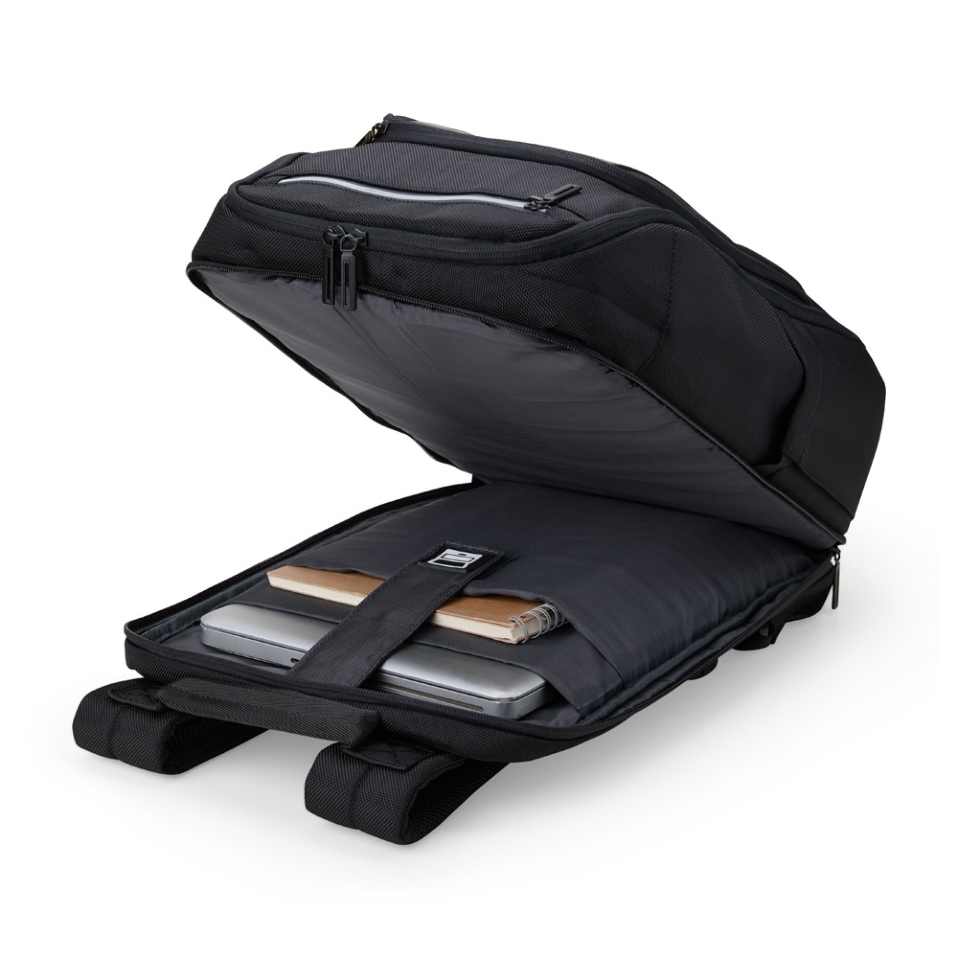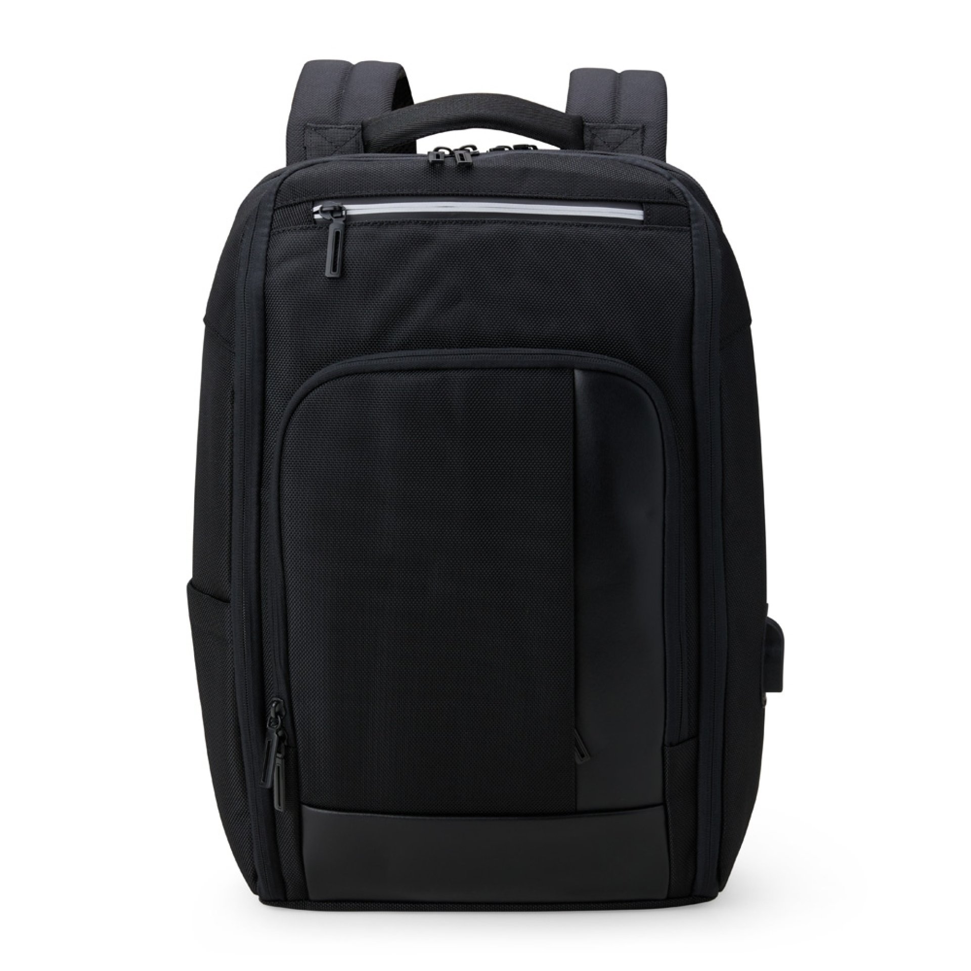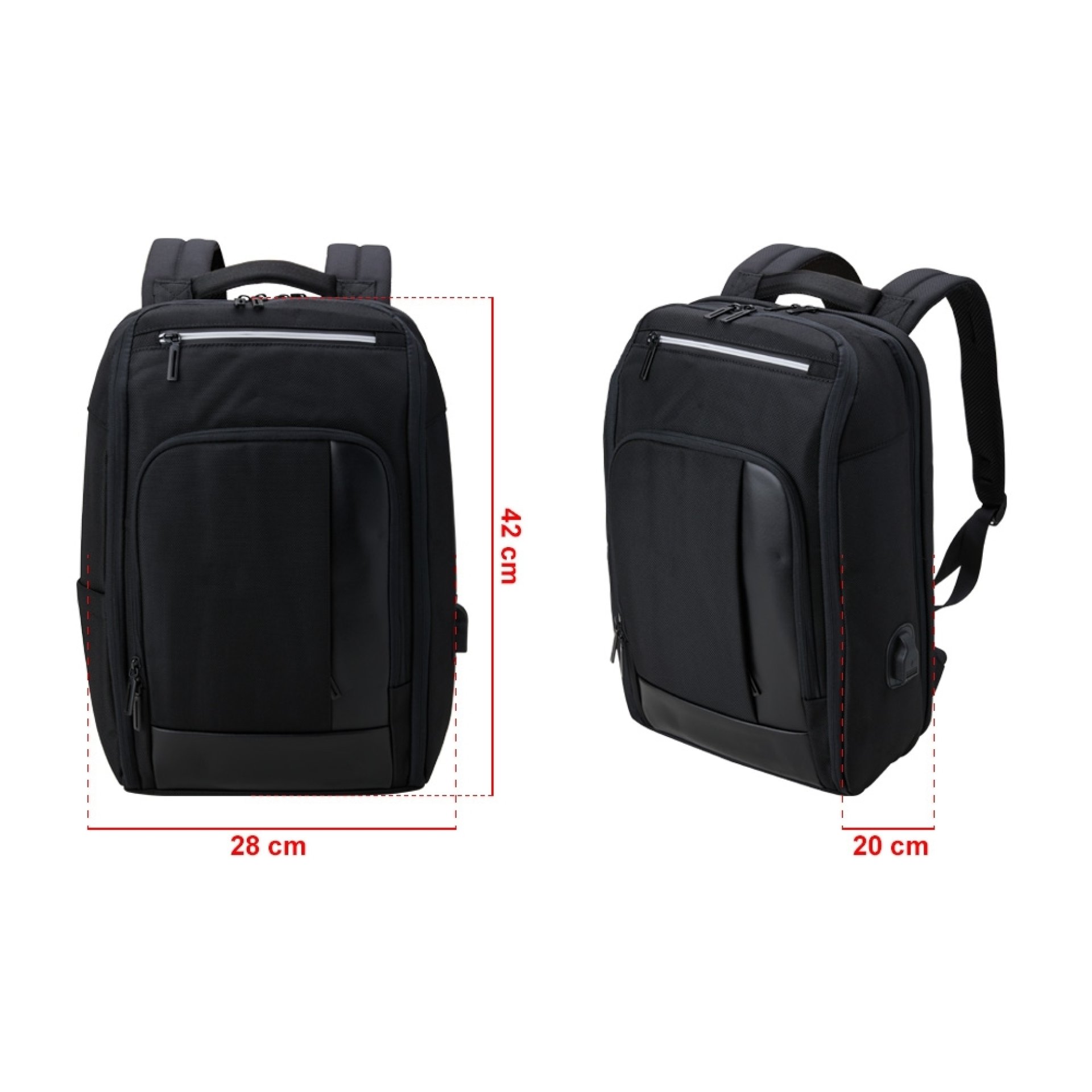 Mochila confeccionada em Nylon 23 litros com detalhes em couro sintético. Contém 5 compartimentos, sendo um bolso com faixa refletiva, divisórias internas para acessórios, bolso para tablet e notebook 15.6, bolso antifurto nas costas, bolso externo na lateral com elástico, suporte externo USB, alça para encaixe em malas de viagem, alças da mochila possuem bolsos integrados para suporte de óculos e cartões.