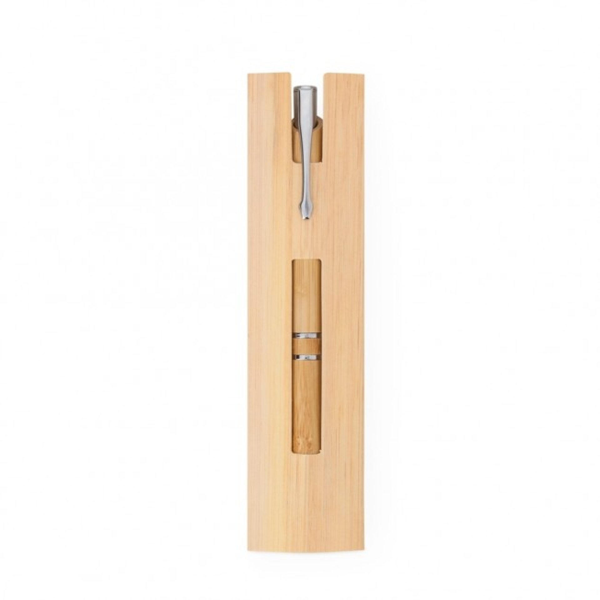A nossa caneta ecológica de bambu é a opção perfeita para acompanhar uma rotina repleta de registros. Com um design elegante, ela conta com clipe metálico, carga esferográfica azul de 1.0mm e acionamento por clique, unindo praticidade e sustentabilidade. Para torná-la ainda mais exclusiva, acompanha um estojo de papel com estampa que imita bambu.