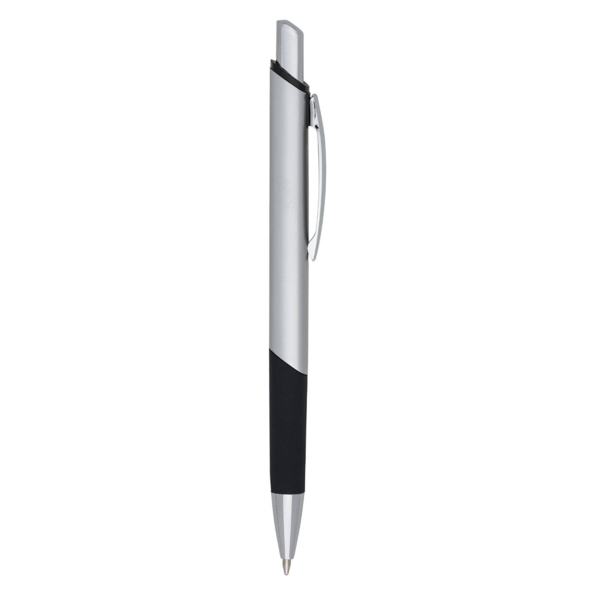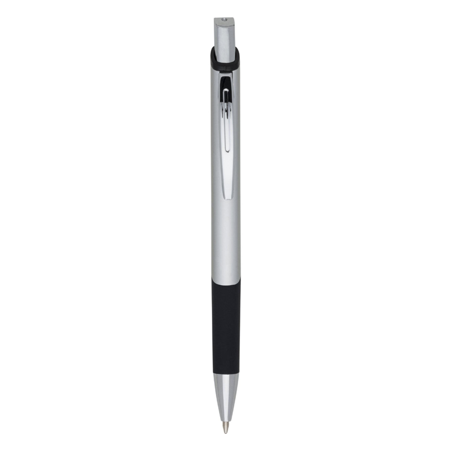 Caneta metálica personalizada, com design quadrangular, acabamento brilhante (exceto a prata) e detalhe emborrachado, carga esferográfica azul e acionamento por clique.