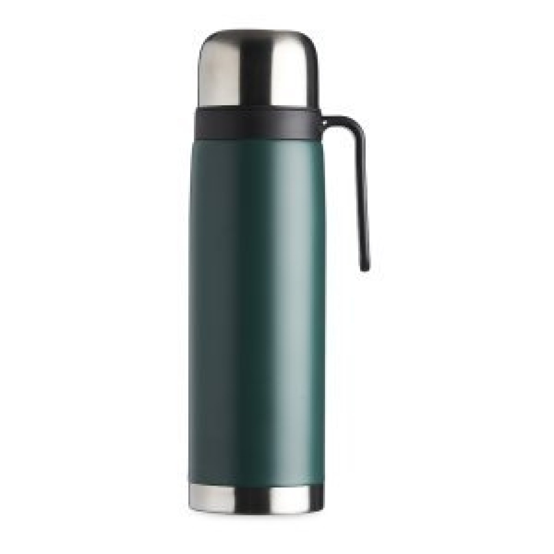 Garrafa térmica 1 litro em inox com alça plástica preta. Possui tampa rosqueável, tampa interna rosqueável com bico plástico vermelho.
