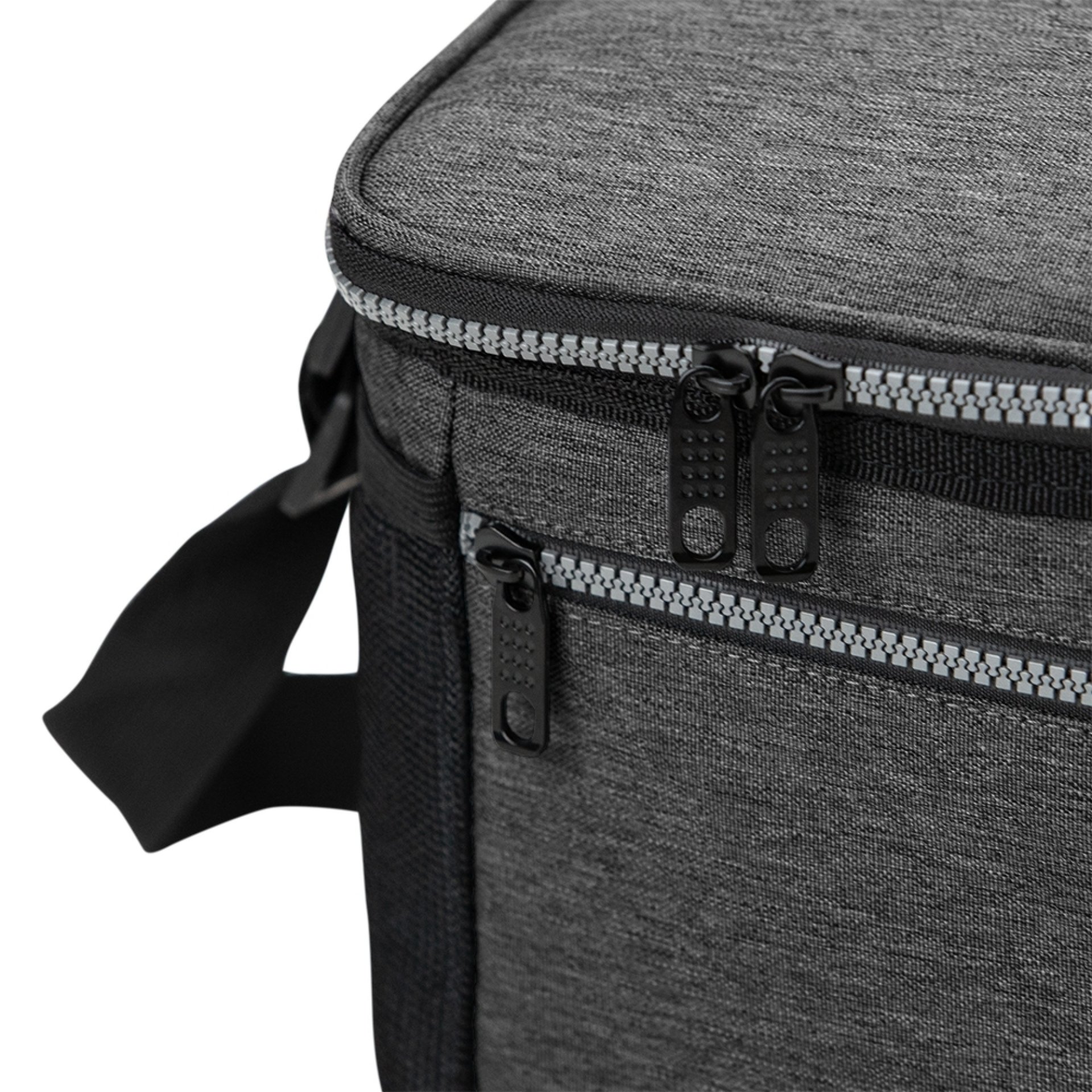 Bolsa térmica de nylon 10 litros com dois compartimentos, sendo o principal com revestimento térmico e bolso telado para utensílios. Possui bolsos laterais em malha e alça transversal com apoio para ombro.