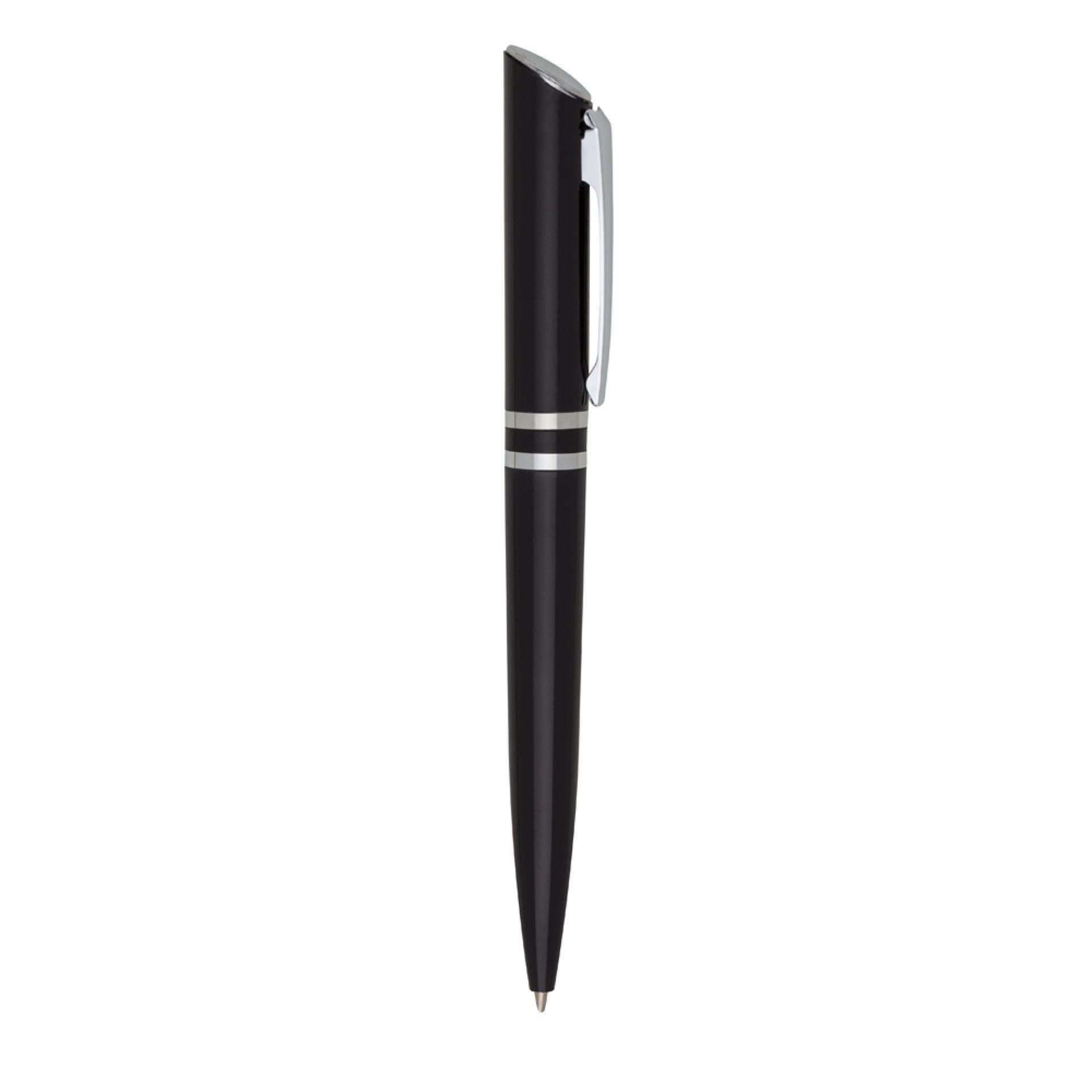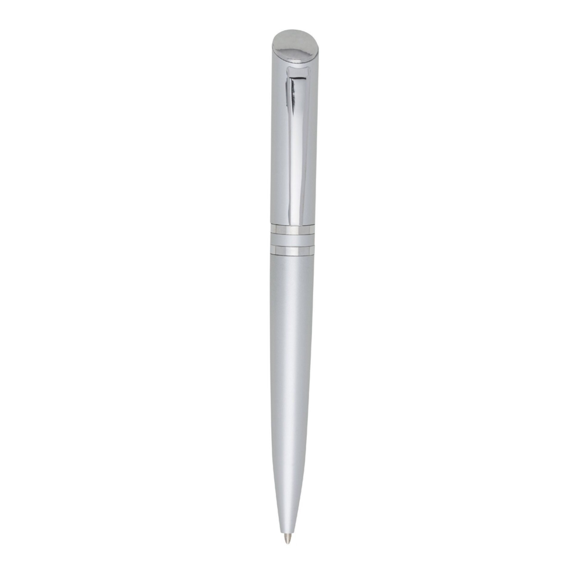 Caneta plástica com carga esferográfica azul e acionamento por rotação.