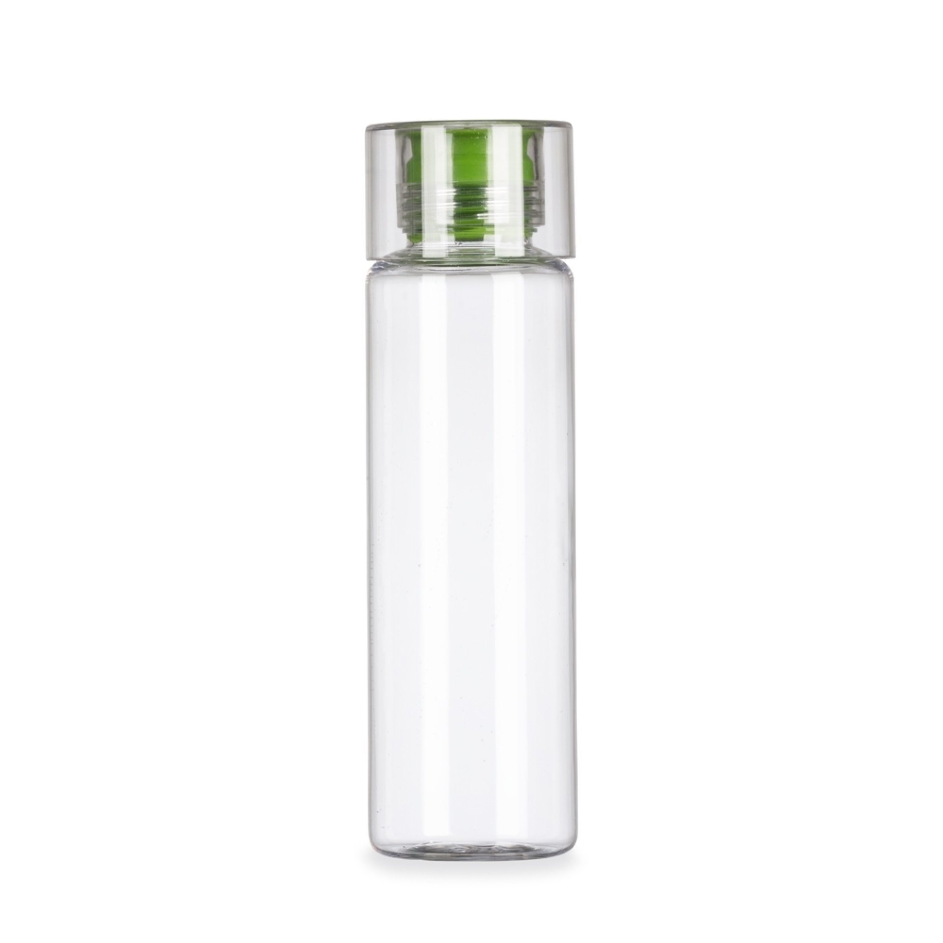 Squeeze plástico 600 ml com tampa rosqueável. Material plástico transparente com tampa, possui bico/tampa interna emborrachada colorida. Ambas rosqueáveis.