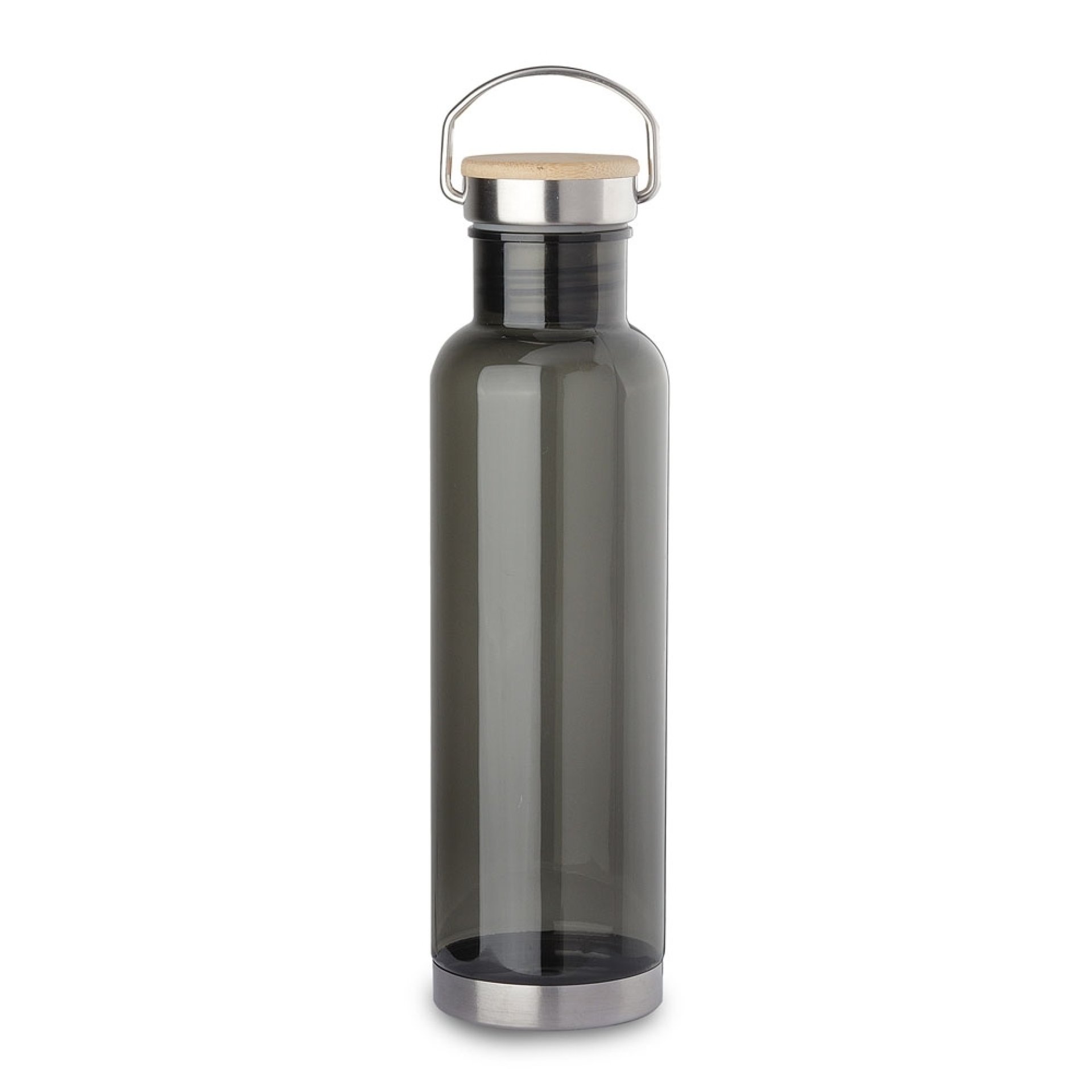 Garrafa plástica 850ml com tampa e base em inox. Tampa com alça de transporte e detalhe em bambu.