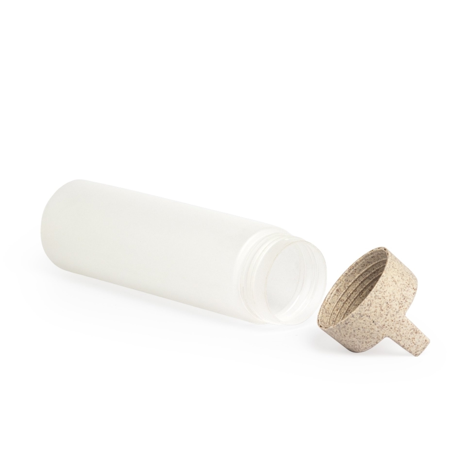 Garrafa plastica com capacidade de 650 ml, com tampa de fibra de arroz rosqueável e alça.