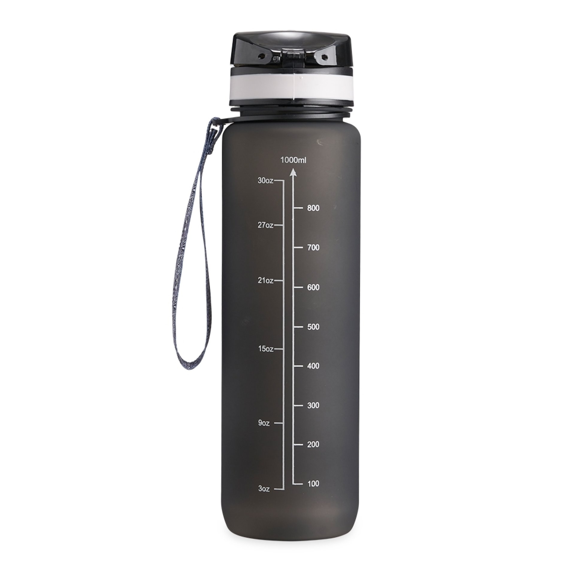 Squeeze plástica de 1 litro com tampa de acionamento automático e trava de segurança. Acompanha cordão de nylon.