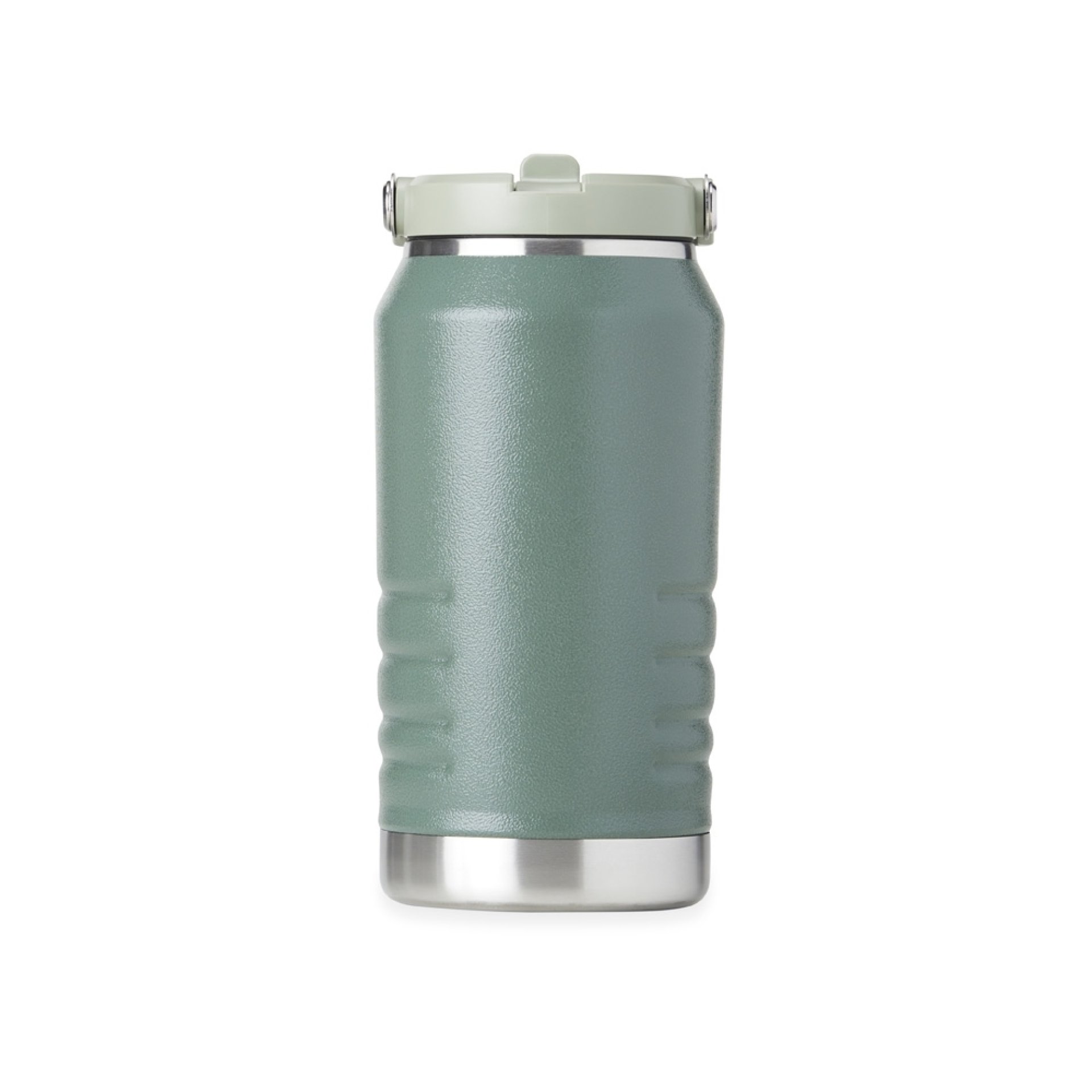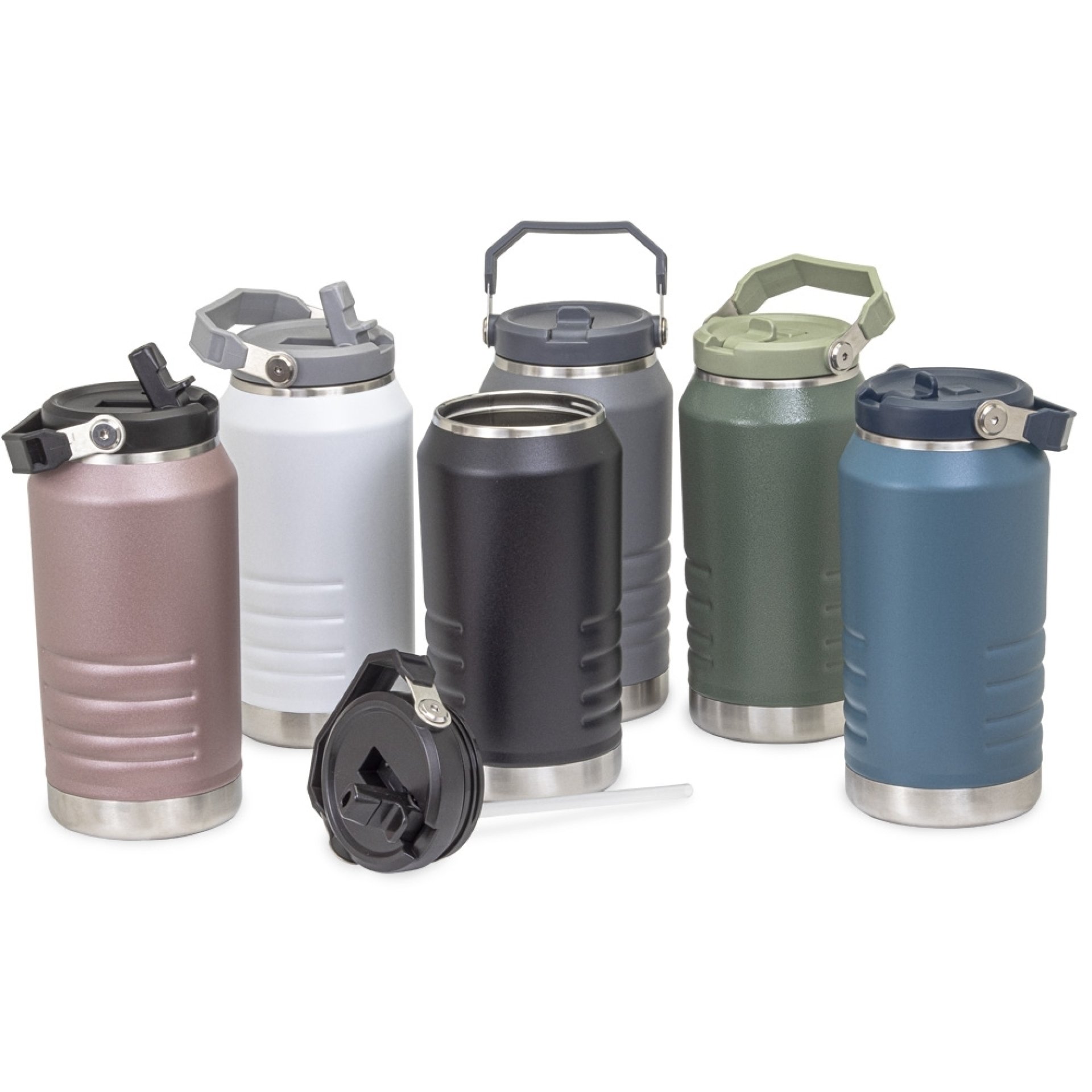 Garrafa térmica feita em inox 304 com parede dupla, capacidade de 1,1 litros. Com alça para transporte, a tampa contém bico flip e canudo interno.