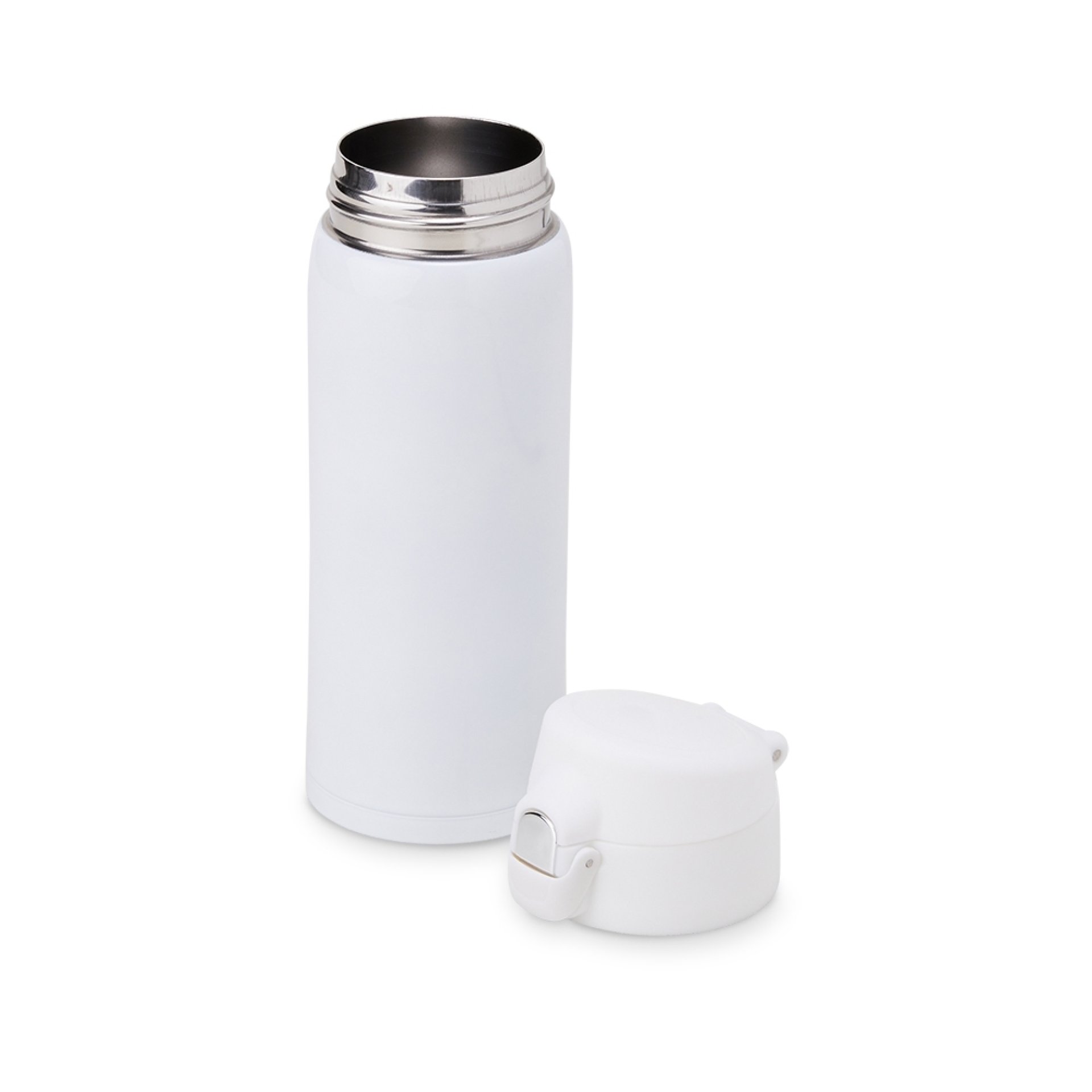 Garrafa térmica parede dupla feita inox 304, capacidade de 400ml. Tampa de polipropileno com botão de acionamento e trava de segurança.
