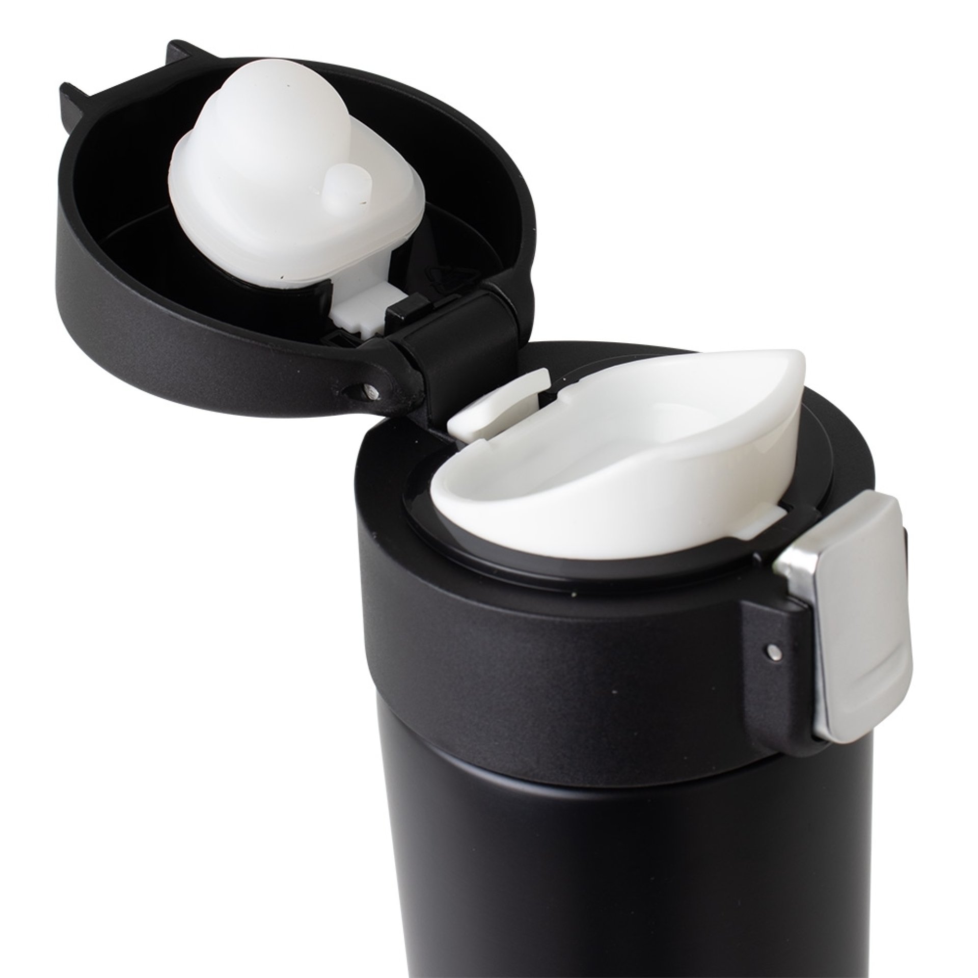 Garrafa Térmica 450 ml em inox com sistema de trava. Contém acabamento fosco e revestimento interno em inox, possui tampa plástica fosca com borracha interna para vedação, evitando o vazamento de líquido, botão central para abertura e trava lateral (basta seguir a orientação dos desenhos de cadeados, simulando o travamento/destravamento da tampa).