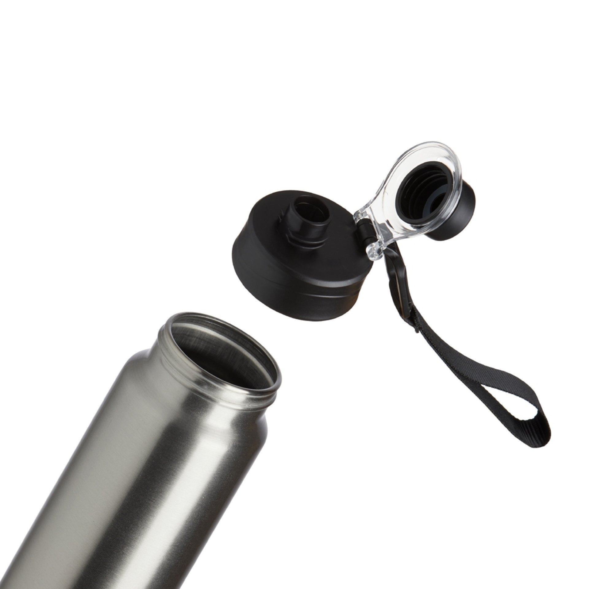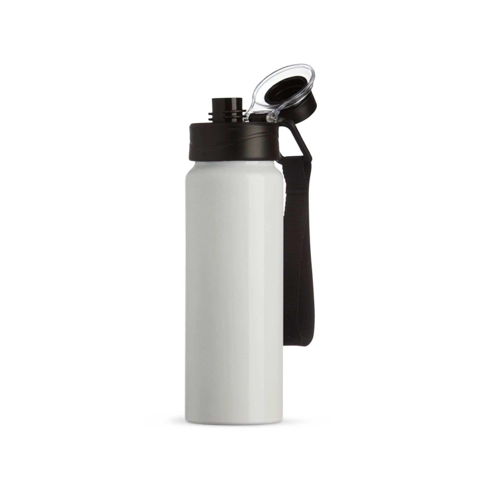 Squeeze Alumínio 800ml, possui tampa rosqueável com proteção para bocal plástica e alças de nylon e plástica.