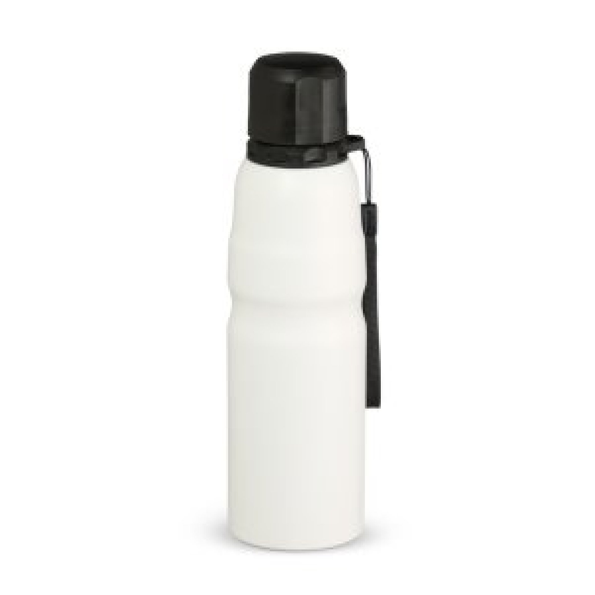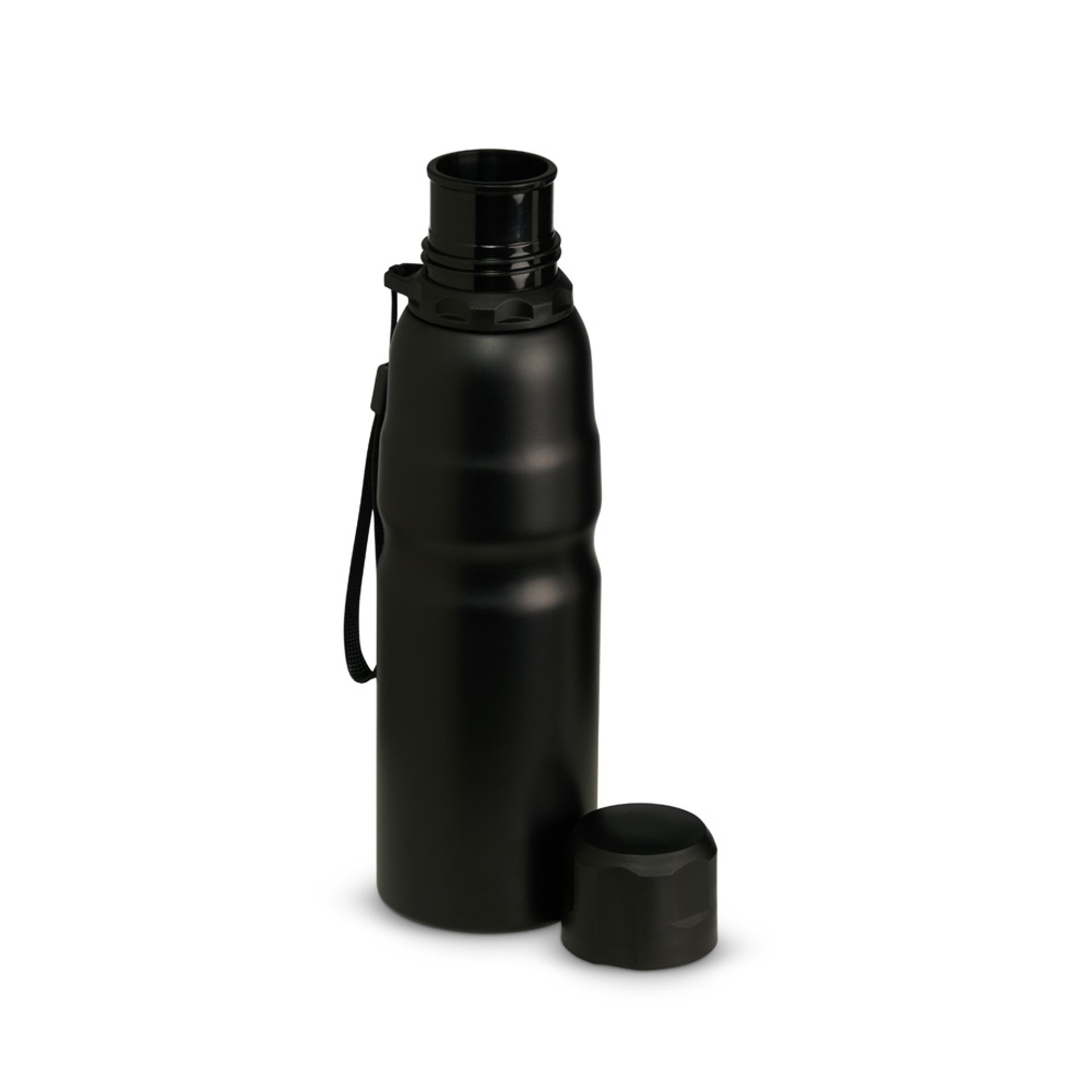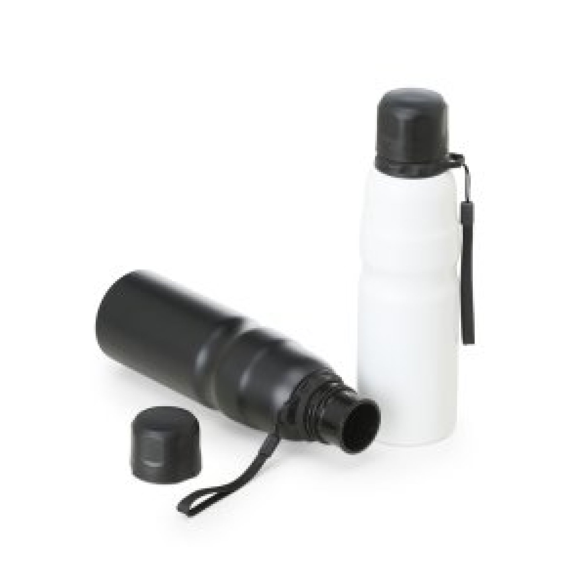 Garrafa inox 800ml com tampa plástica rosqueável e cordão para transporte.