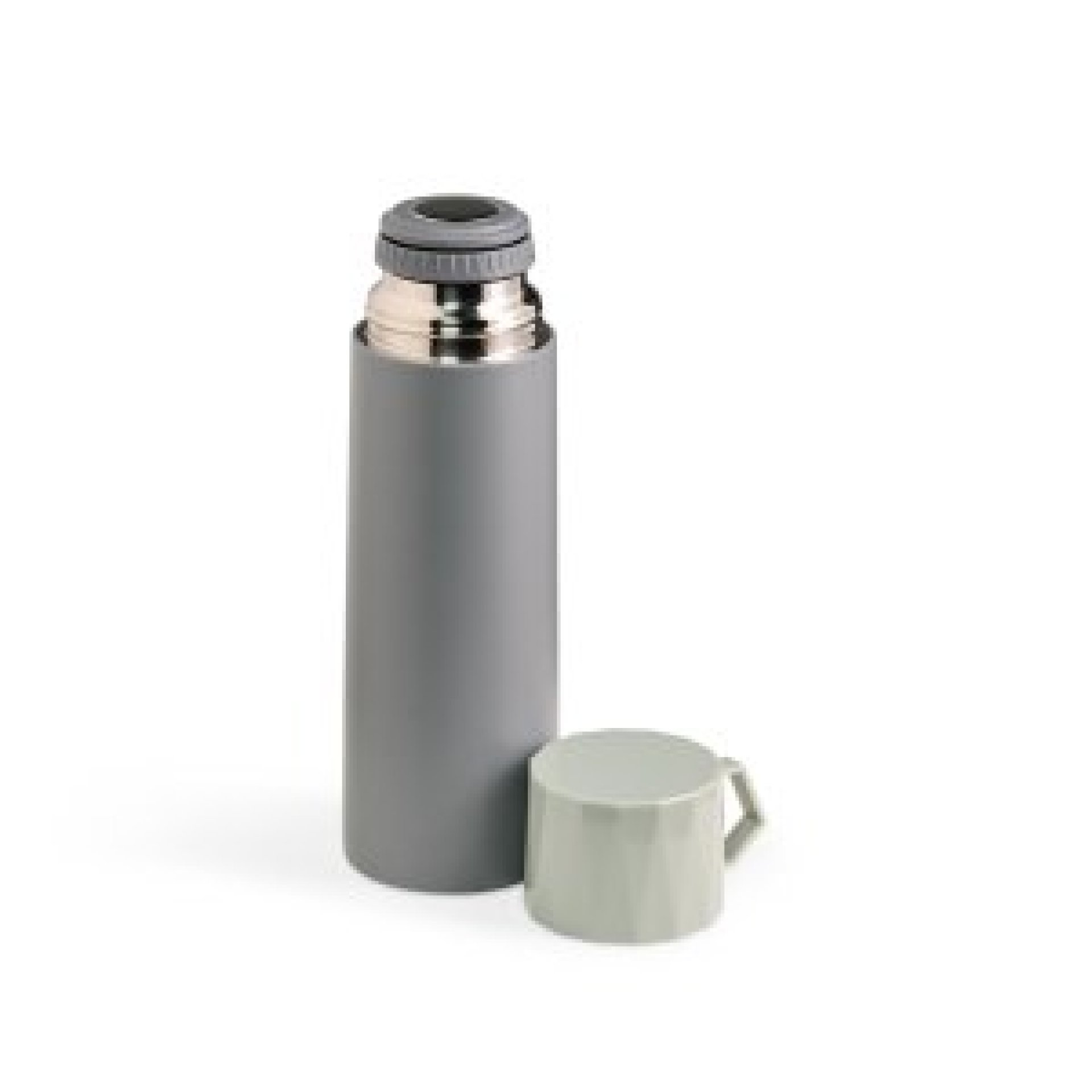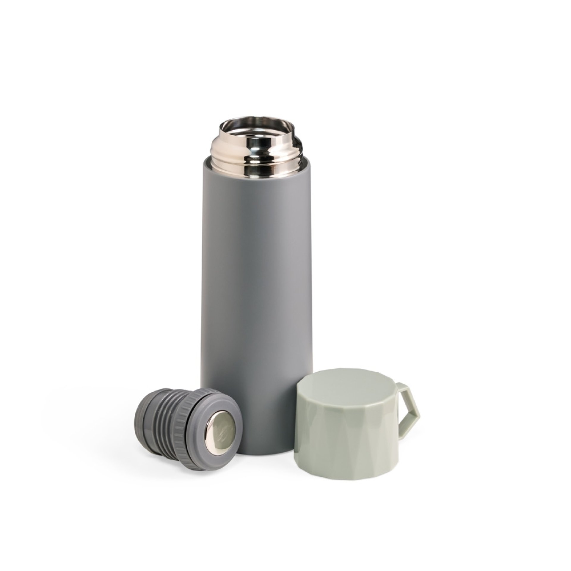 Garrafa térmica 500ml inox cinza com tampa que pode ser utilizada como caneca, tampa interna em plástico resistente (basta um clique para abrir ou fechar).