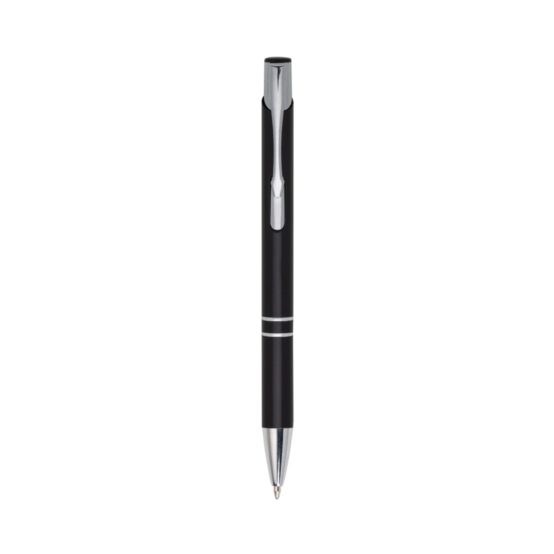 Caneta metálica com carga esferográfica azul e acionamento por clique.