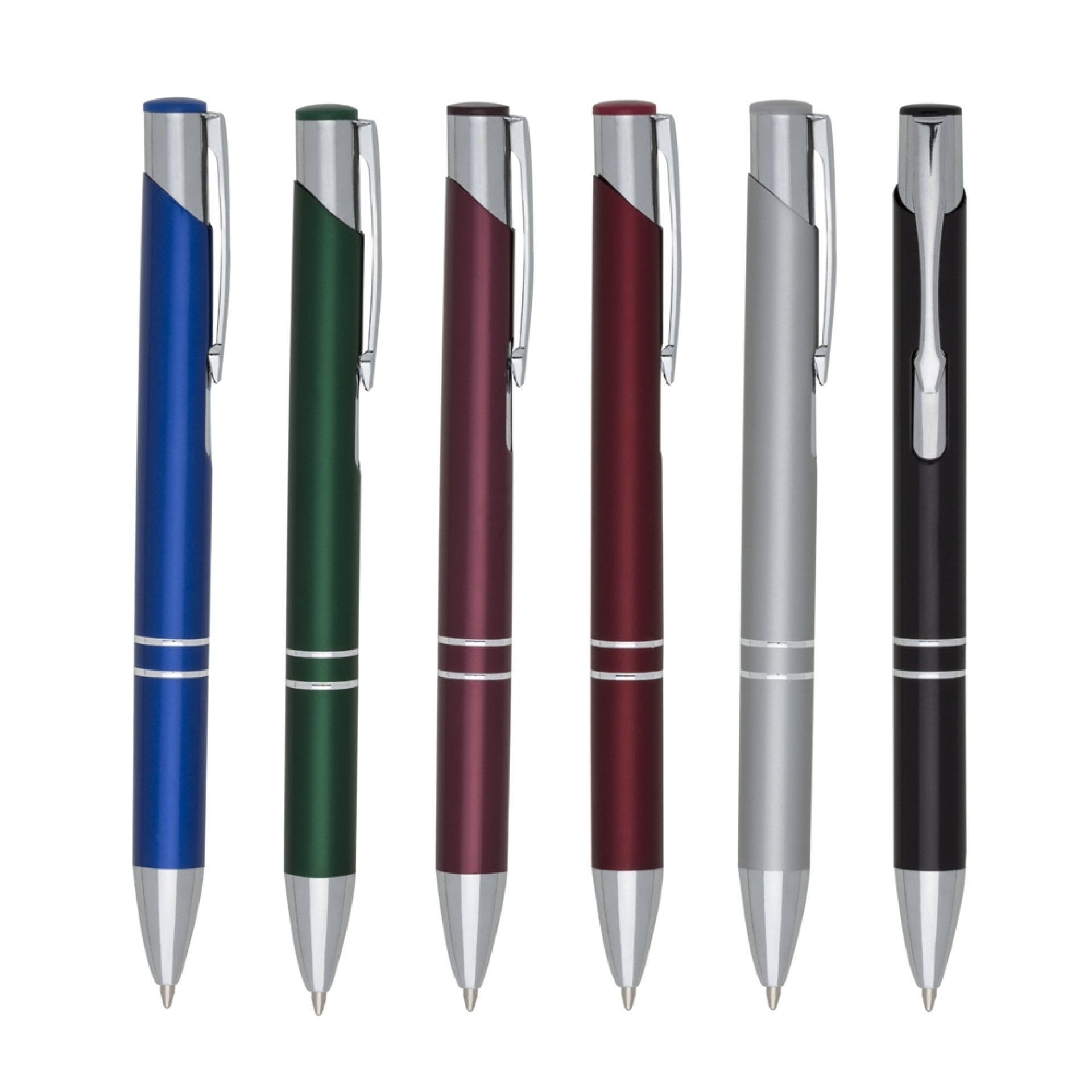 Caneta metálica com carga esferográfica azul e acionamento por clique.