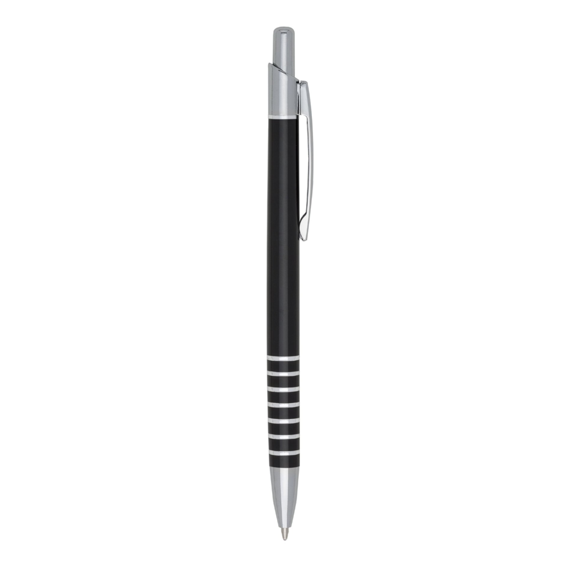 Caneta metálica com carga esferográfica azul e acionamento por clique.