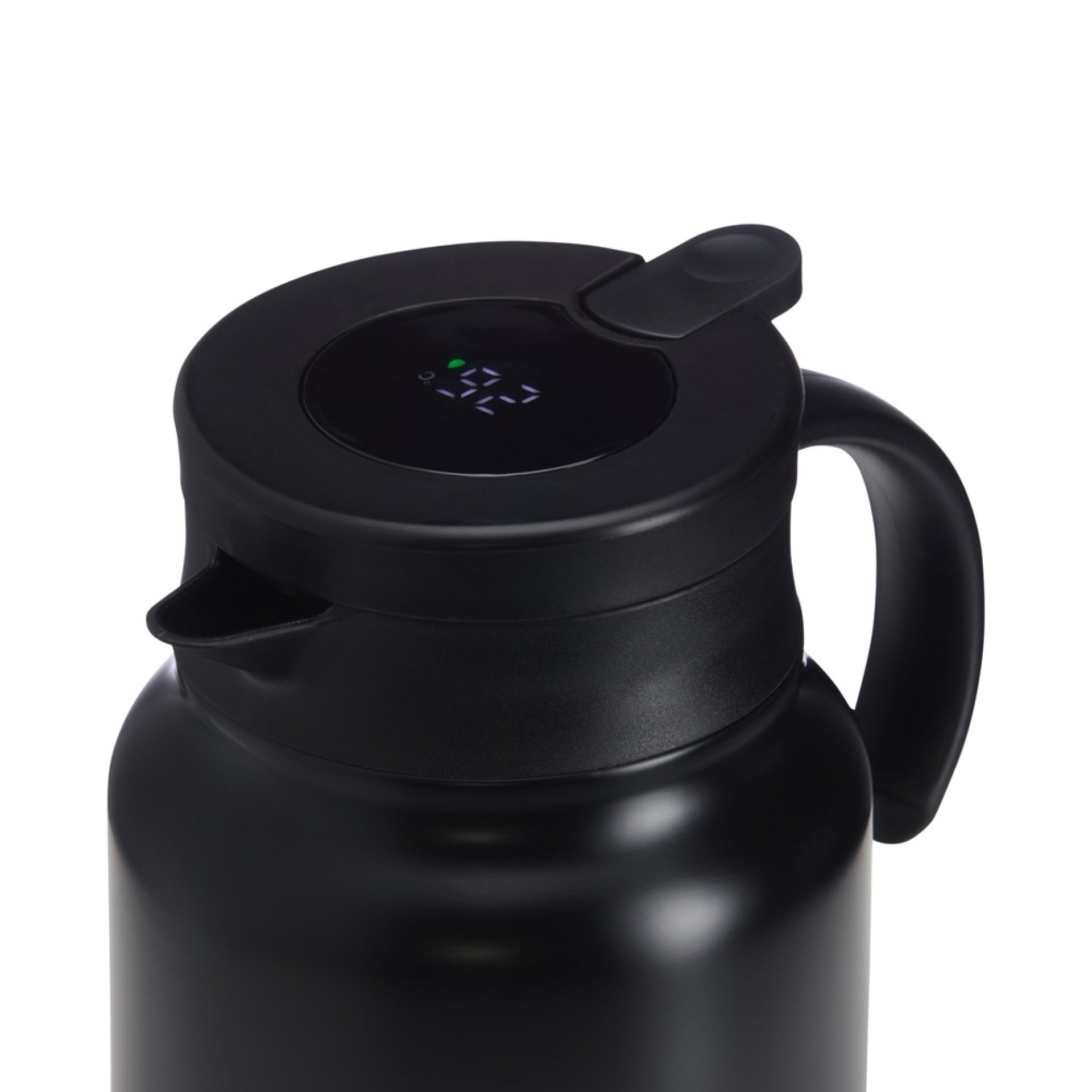 Chaleira 750 ml feita em inox com infusor, display LED e termômetro digital na tampa para indicar a temperatura do líquido. Possui base antiderrapante, alça e tampa plástica com alavanca de acionamento.