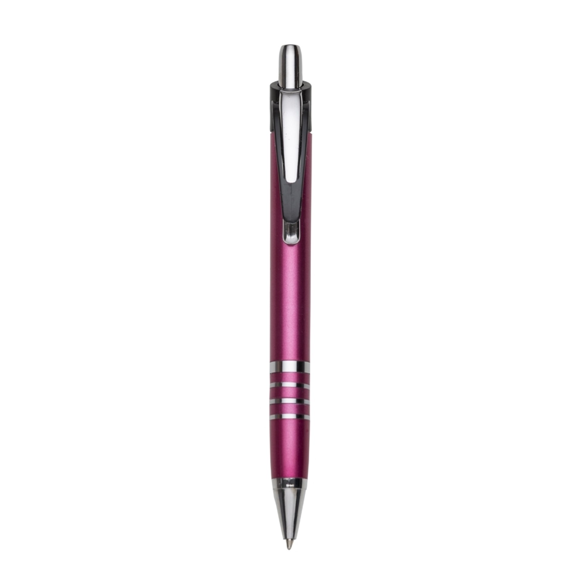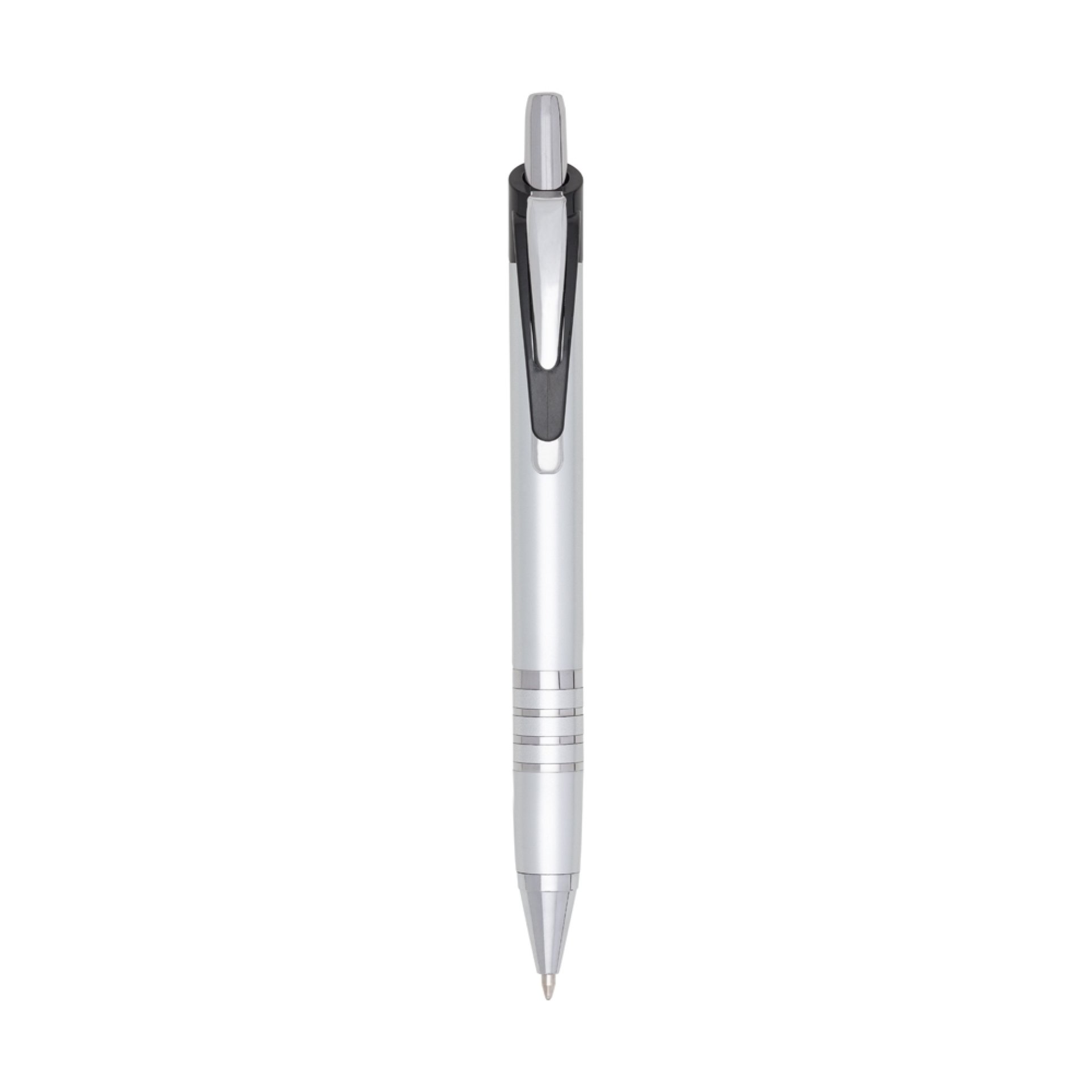 Caneta plástica com carga esferográfica azul e acionamento por clique.