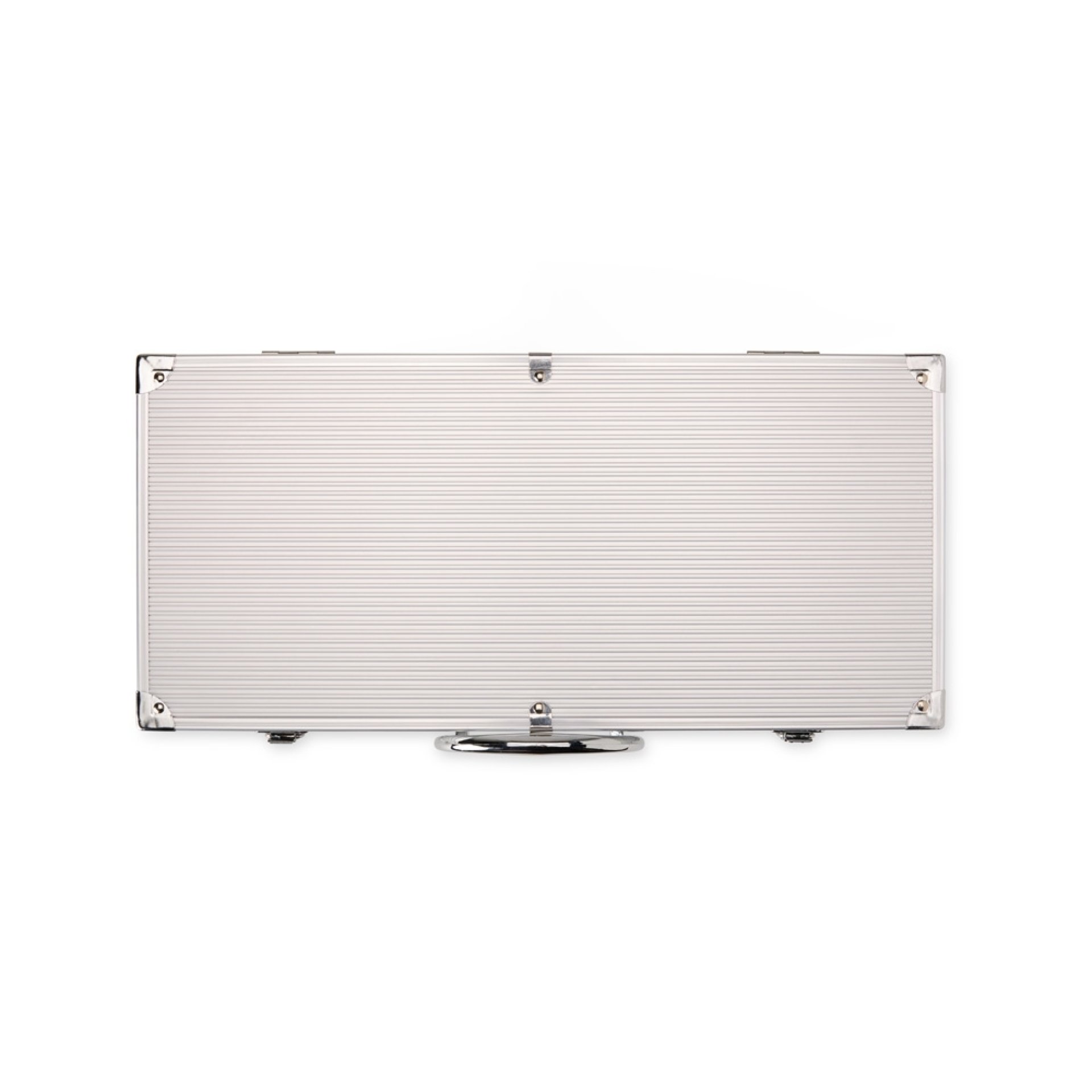 Kit churrasco 10 peças em maleta de alumínio com travas de segurança e placa central para personalização. Contém: espátula, pegador, escova para grelha, faca, pincel, garfo e quatro espetos, parte interna da maleta com revestimento em TNT e suportes de velcro para fixação das peças.
