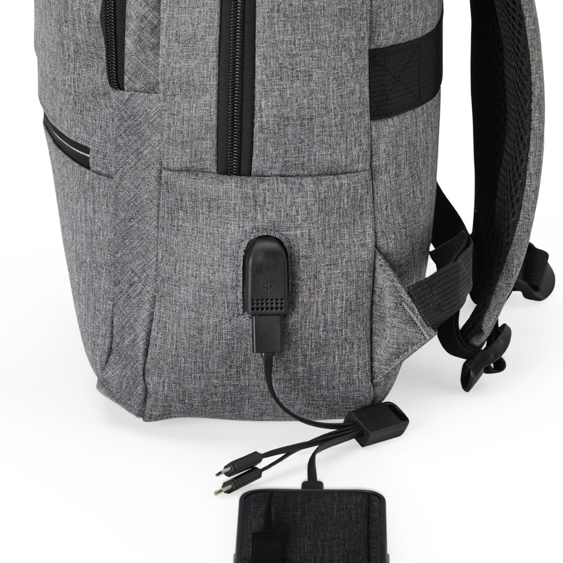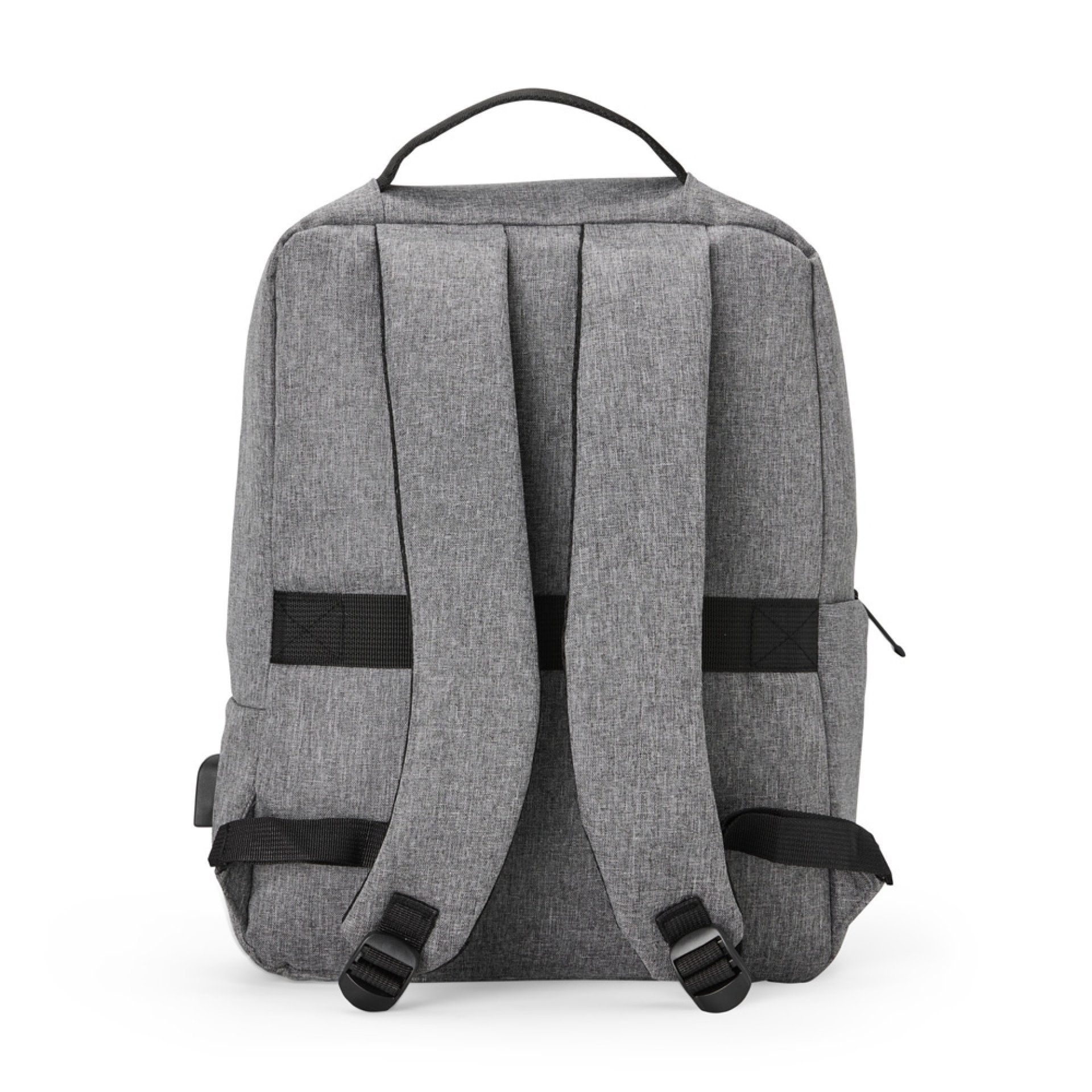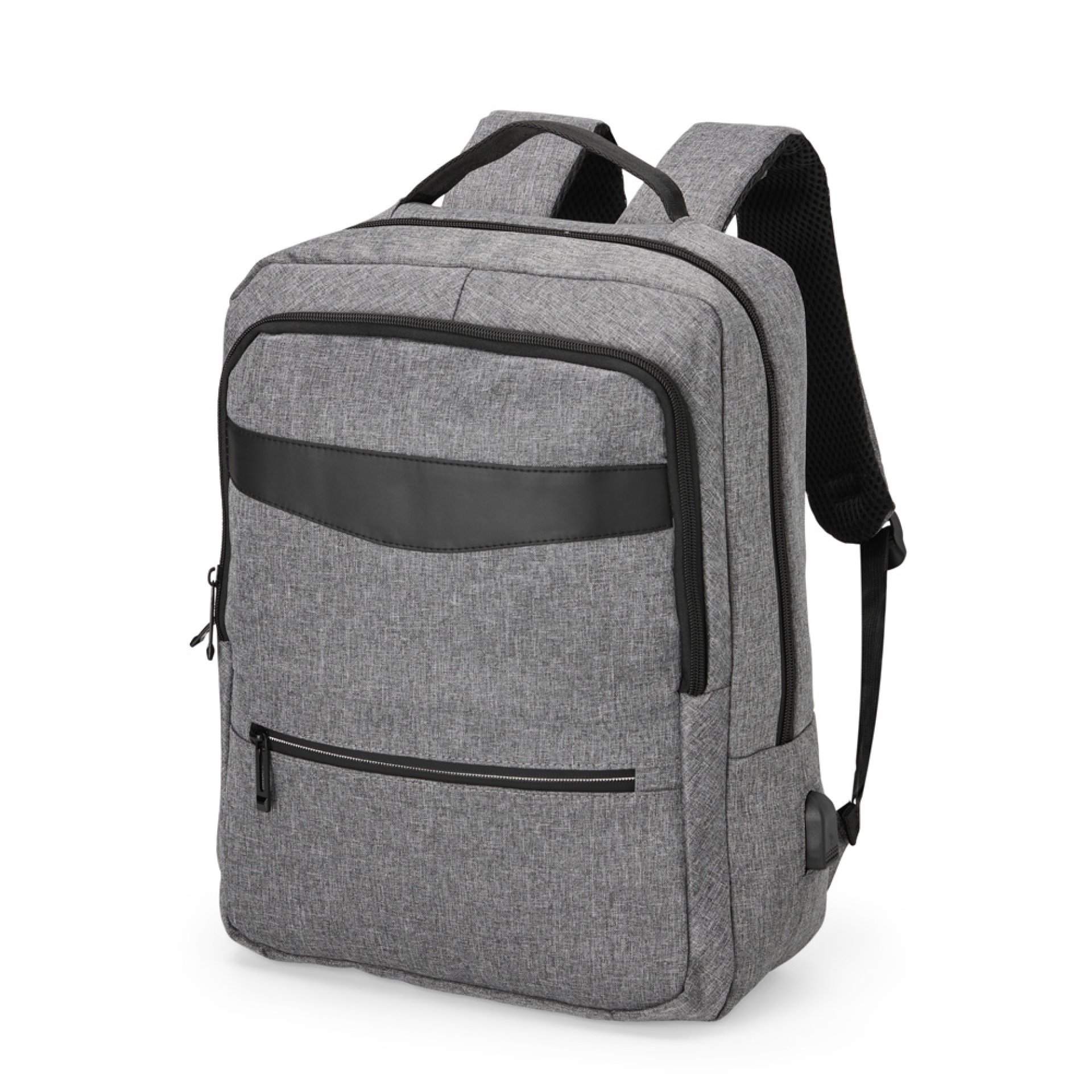 Mochila de nylon 22 Litros com detalhes em couro sintético e três compartimentos, sendo o principal com bolso para notebook 15,6. Mochila possui bolso lateral e suporte externo usb.