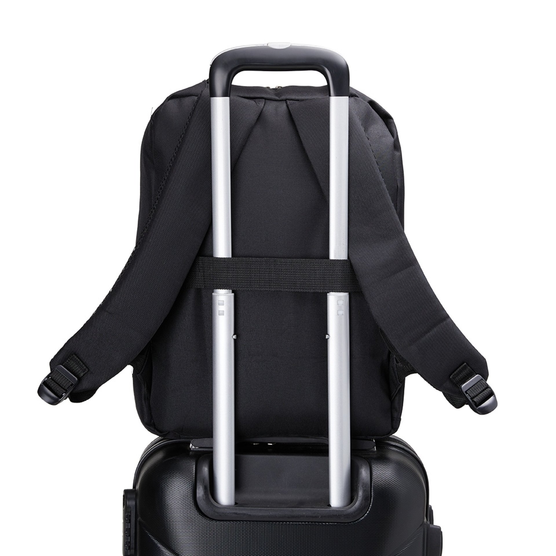Mochila de nylon 26 Litros com detalhes em couro sintético e quatro compartimentos, sendo o principal com bolso para notebook 15,6. Com divisórias internas para acessórios, a mochila possui bolso lateral, suporte externo USB e alça para engate em malas de viagem.
