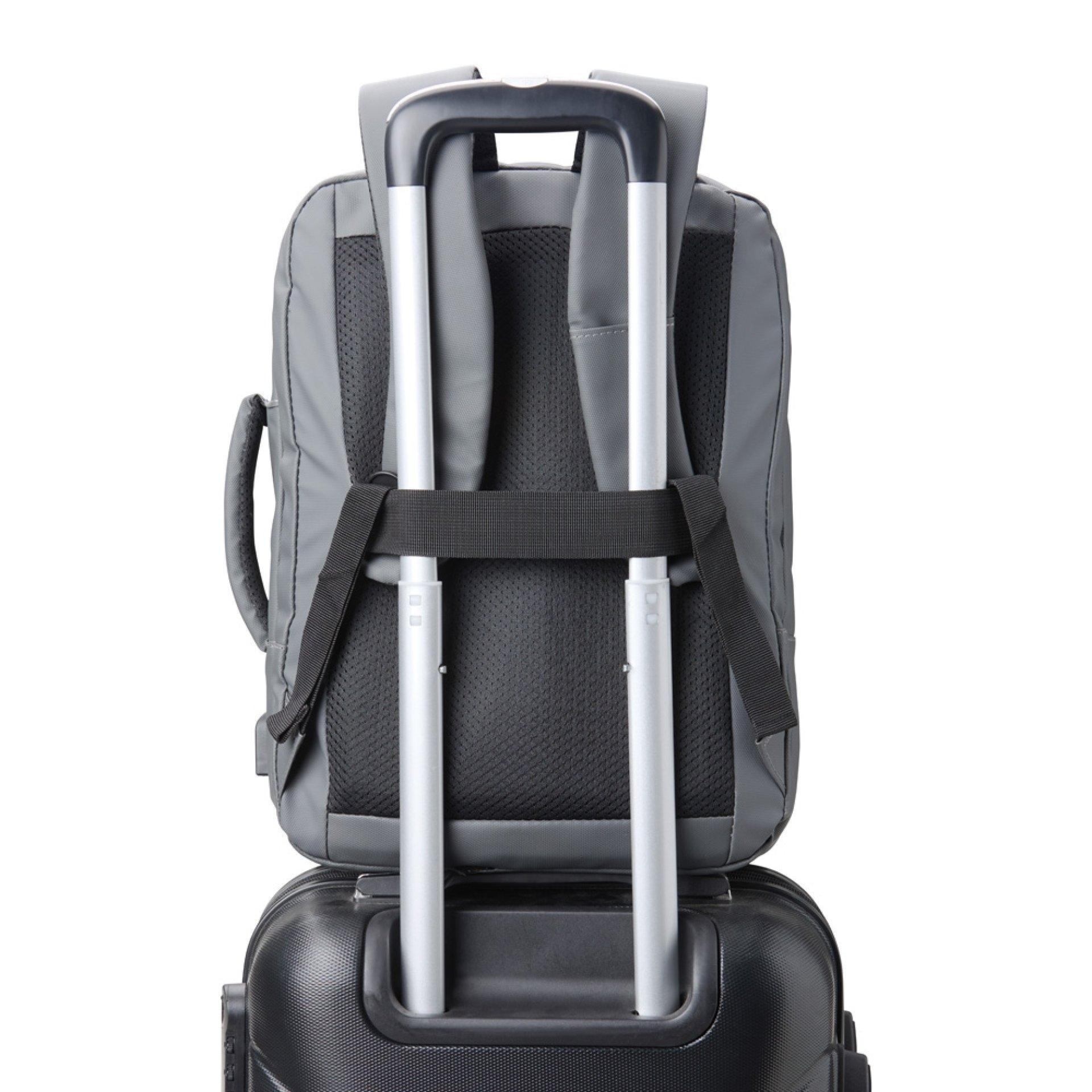 Mochila em couro sintético 23 litros resistente à água com quatro compartimentos, sendo o principal com bolso para notebook 15,6 e tablet 10. Com divisórias internas para acessórios, a mochila possui suporte externo usb, alça para encaixe em malas de viagem e duas alças de mãos, sendo uma delas lateral para o transporte da mochila no modo pasta.