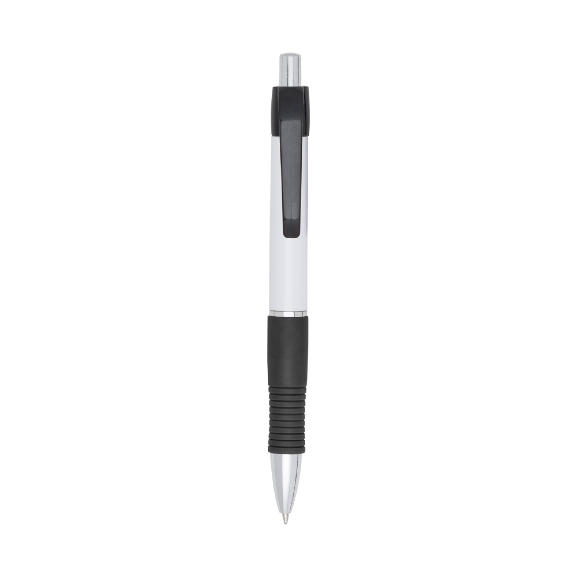 Caneta plástica com detalhe emborrachado, carga esferográfica azul e acionamento por clique.