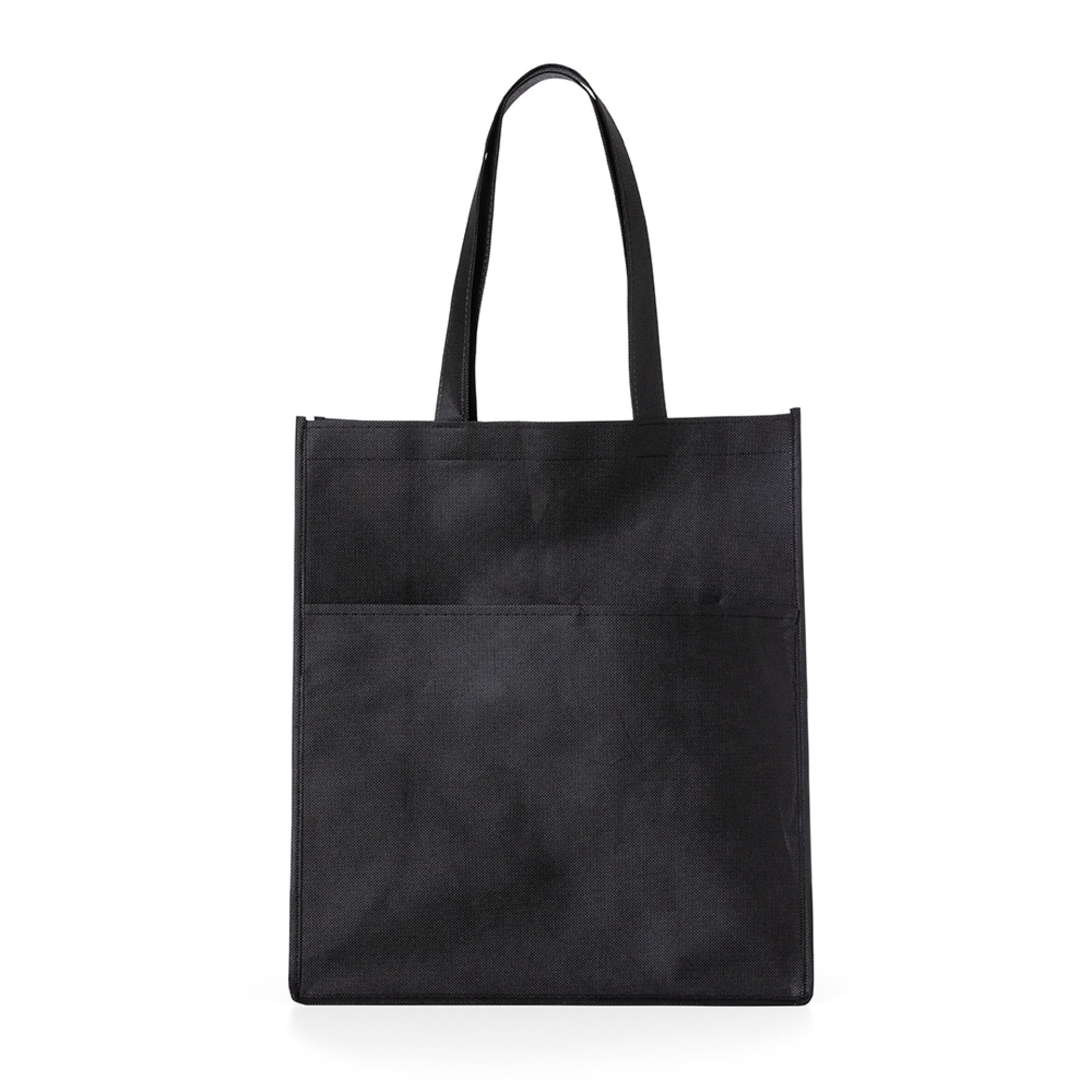 Sacola ecológica com bolso frontal externo e fundo amplo, contém alças para transporte.