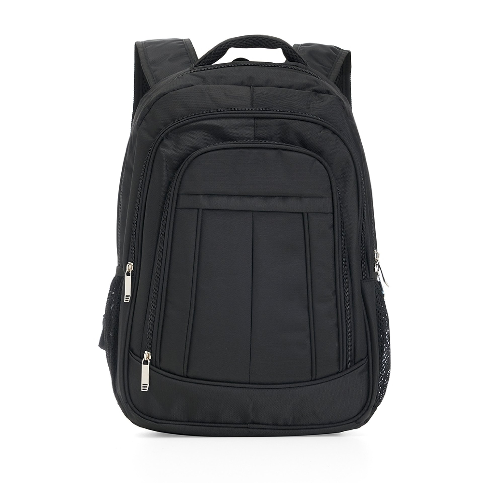 Mochila de poliéster 26 litros com três compartimentos, sendo o principal com bolso para notebook 156. A mochila possui bolsos laterais em malha, duas alças de mãos e área costada com revestimento espumado.