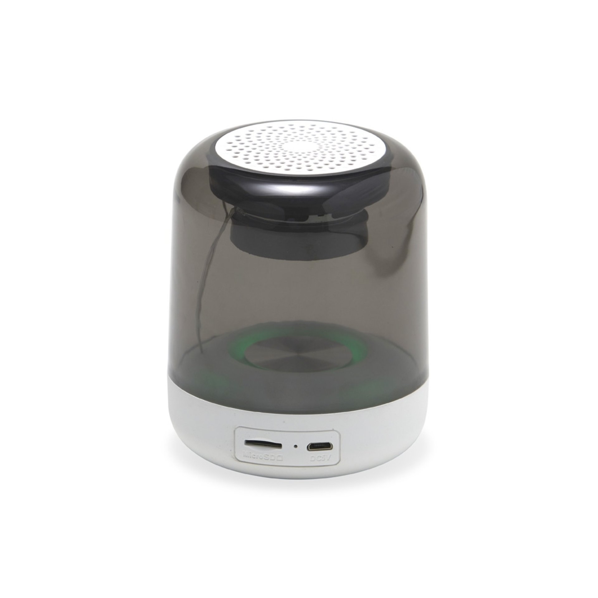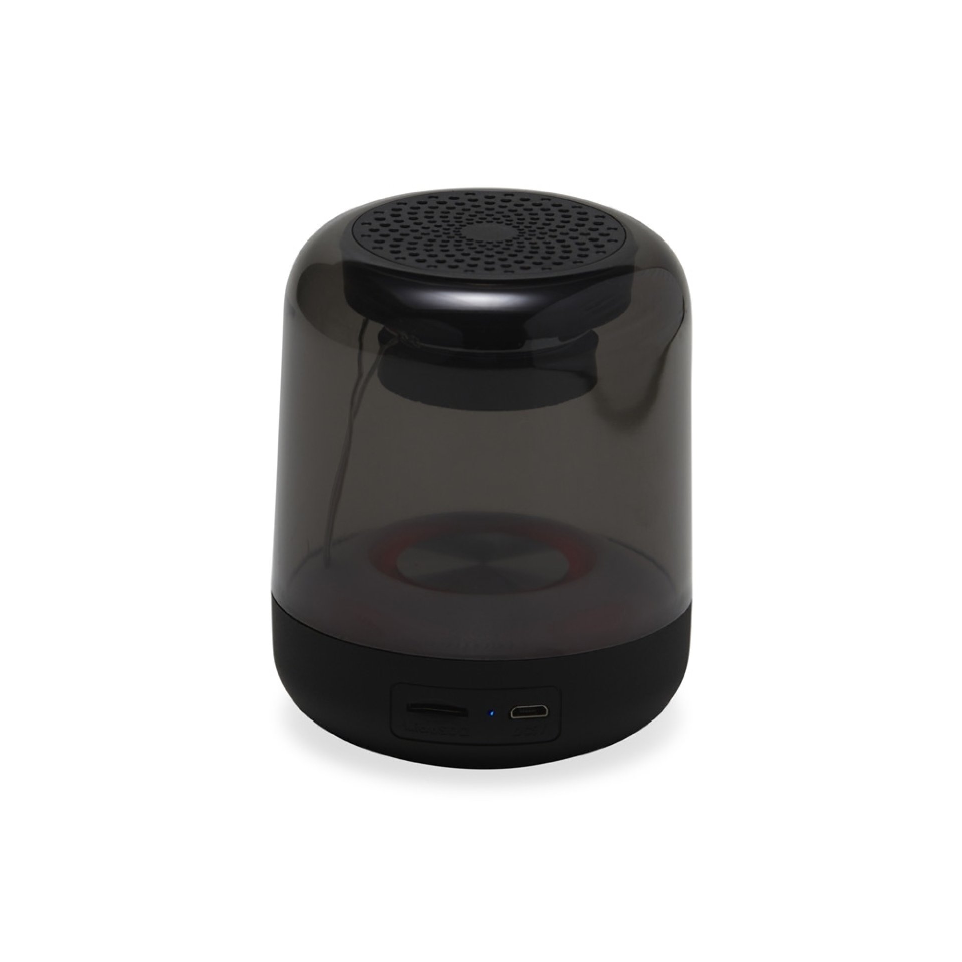 Caixa de som multimídia com luzes led. Operante nos modos bluetooth, rádio FM e cartão TF (MicroSD). Acompanha cabo USB.