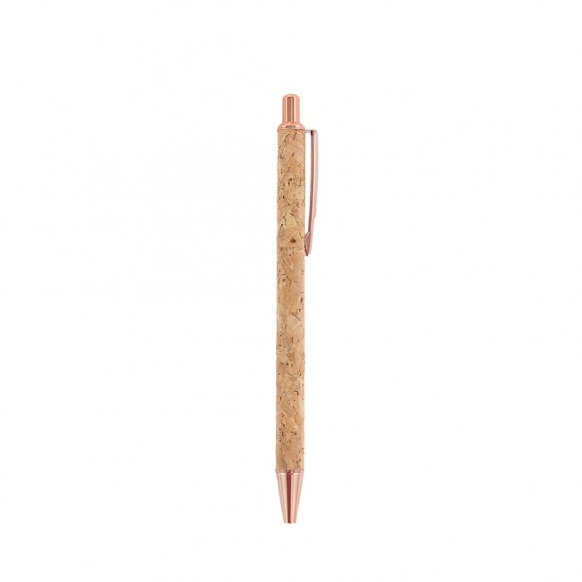 Caneta de cortiça com carga esferográfica azul 1.0mm e acionamento por clique. Clipe metálico, acionador e ponteira plástica.