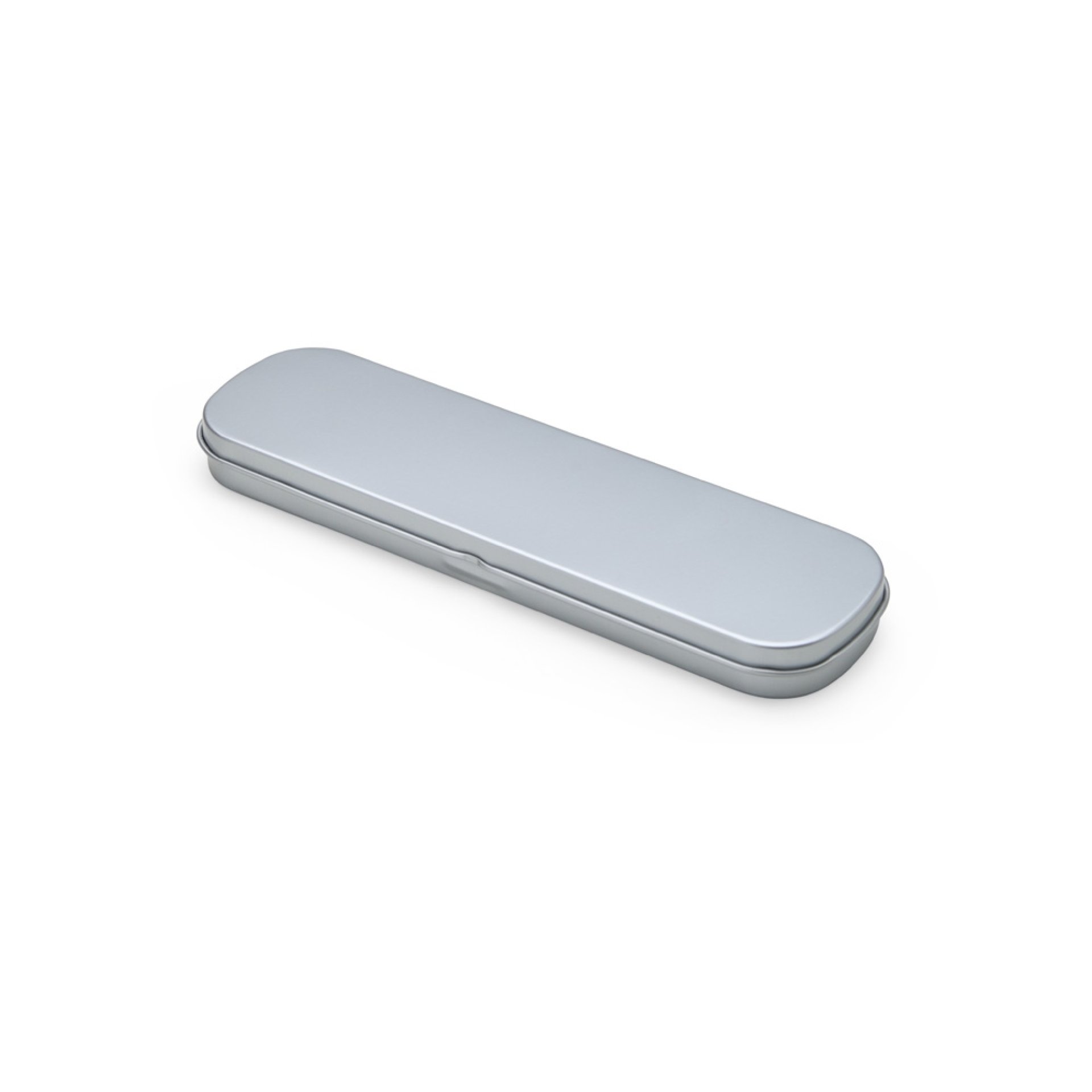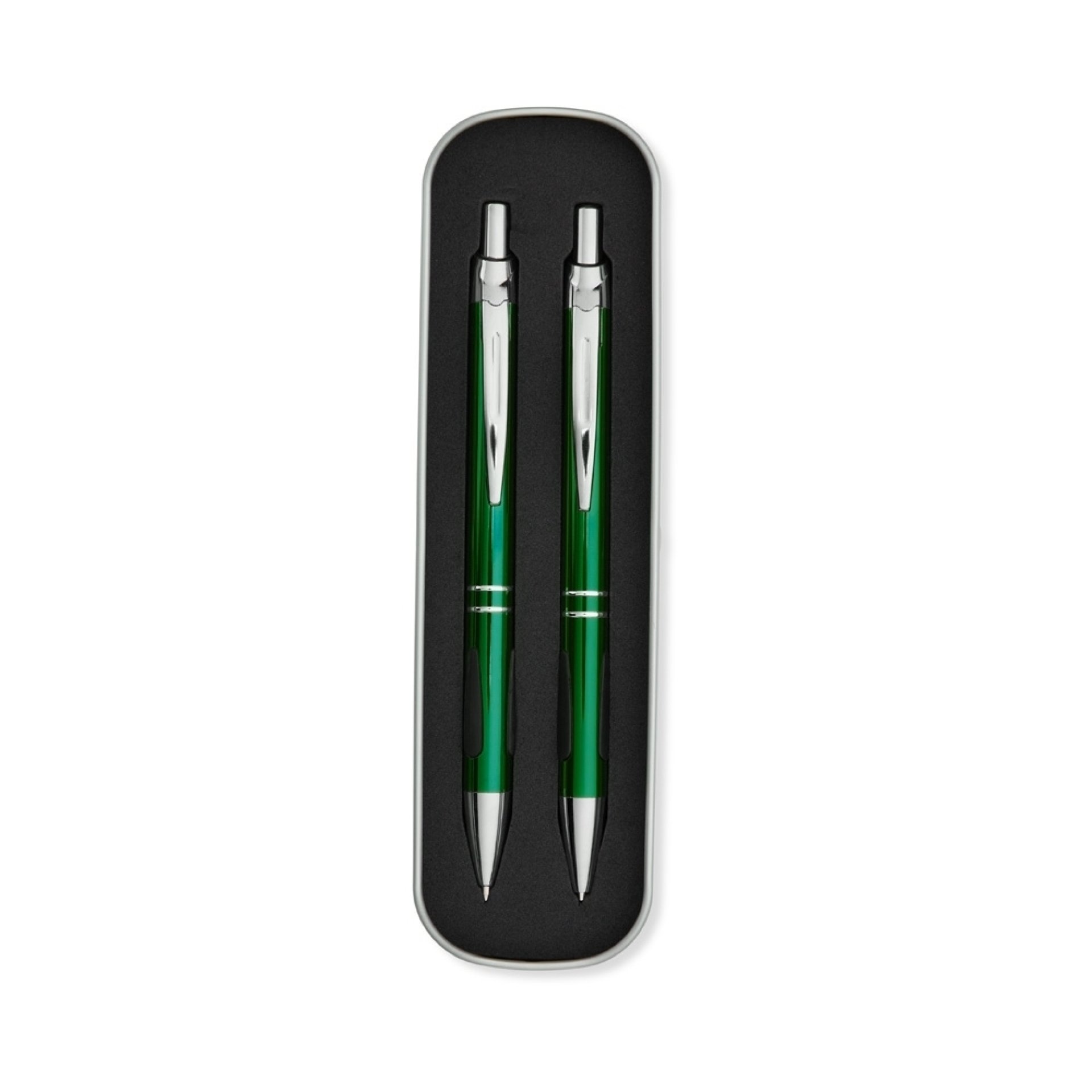 Conjunto de caneta e lapiseira metálicas em estojo de metal. Caneta e lapiseira possuem acabamento fosco, detalhe emborrachado na parte inferior, carga esferográfica azul de 1.0mm e acionamento por clique. Estojo revestido em espuma.