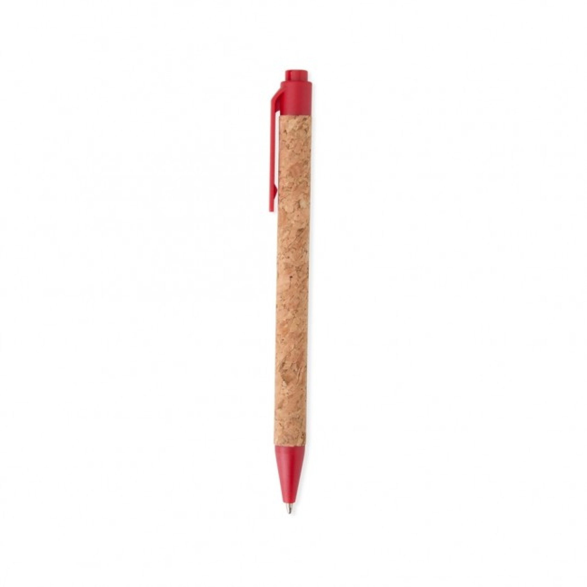 Caneta de cortiça com detalhes em palha de trigo, carga esferográfica azul 1.0mm e acionamento por clique.