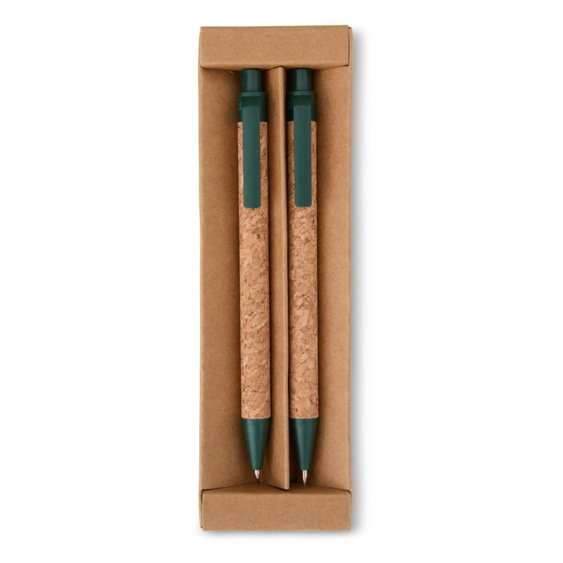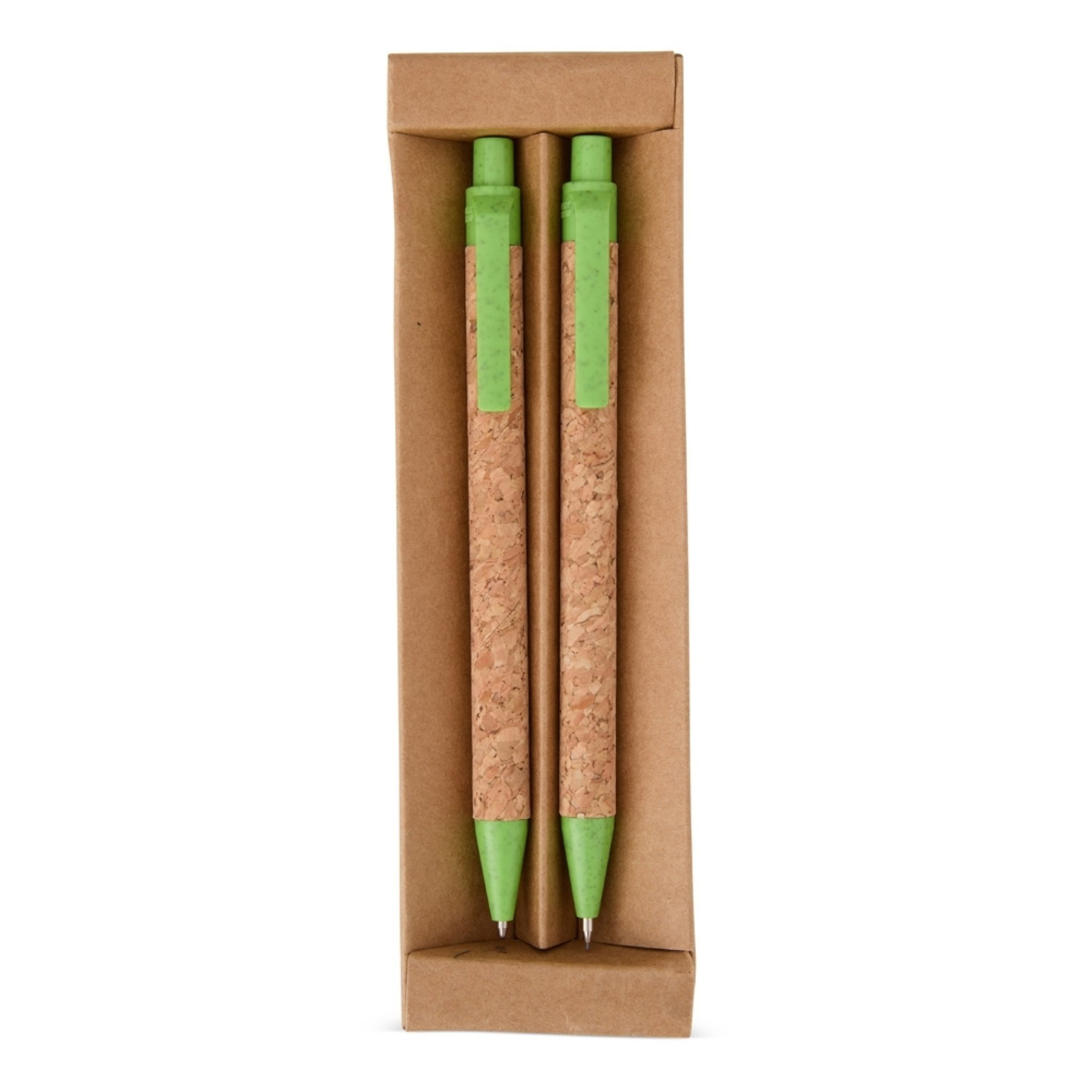 Kit ecológico, caneta e lapiseira de cortiça com detalhe em palha de trigo e estojo de kraft. Carga esferográfica azul 1mm e lapiseira 0.7mm com acionamento por clique.