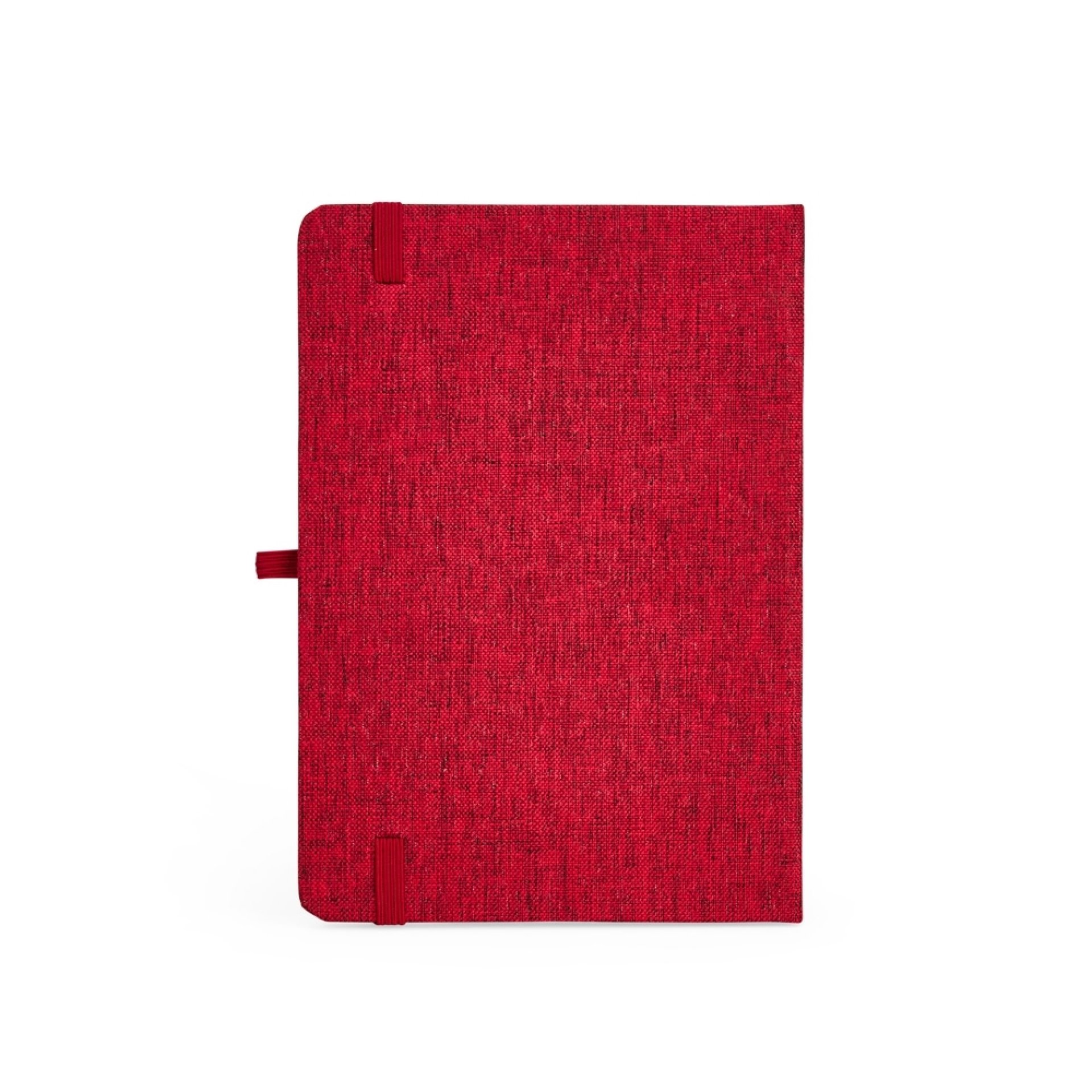 Caderneta feita de linho com porta caneta elástico, marcador de página em cetim e fita elástica para fechar. Contém aproximadamente 80 folhas brancas pautadas.