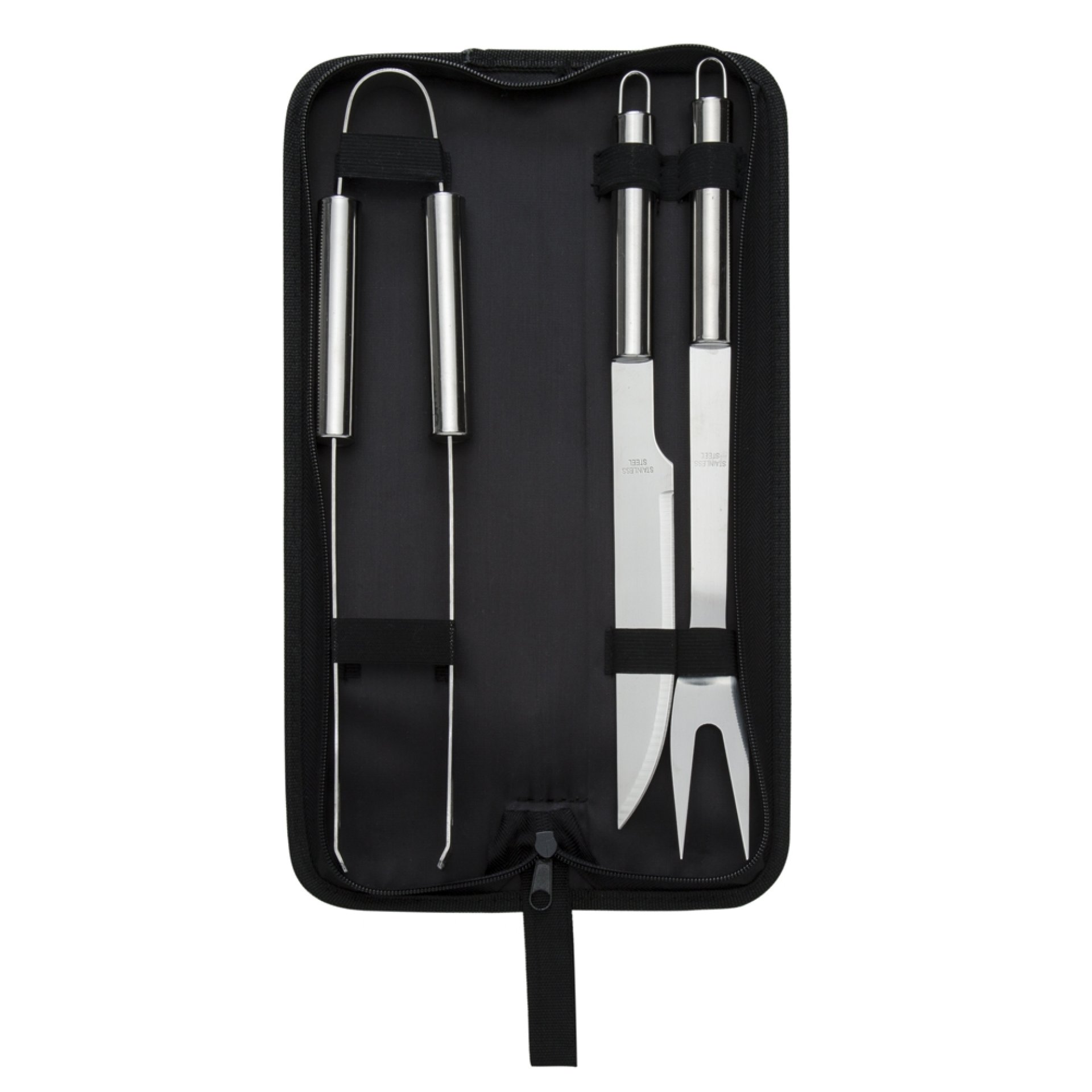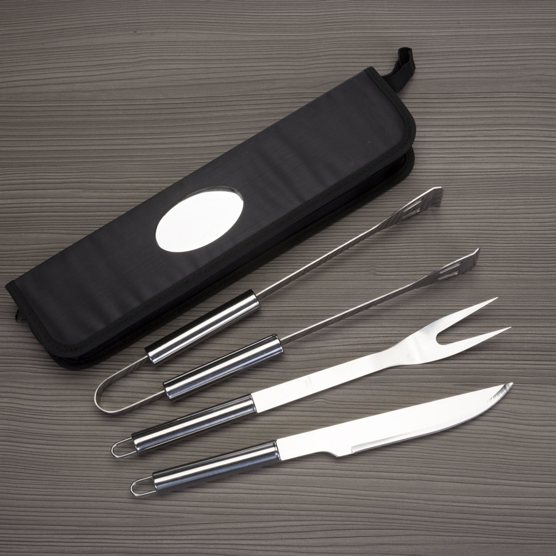 Tamanho total aproximado (CxL): Faca 32,7 cm x 2,6 cm – Garfo 33,4 cm x 3,3 cm x Pegador 34,2 cm x 5,6 cm