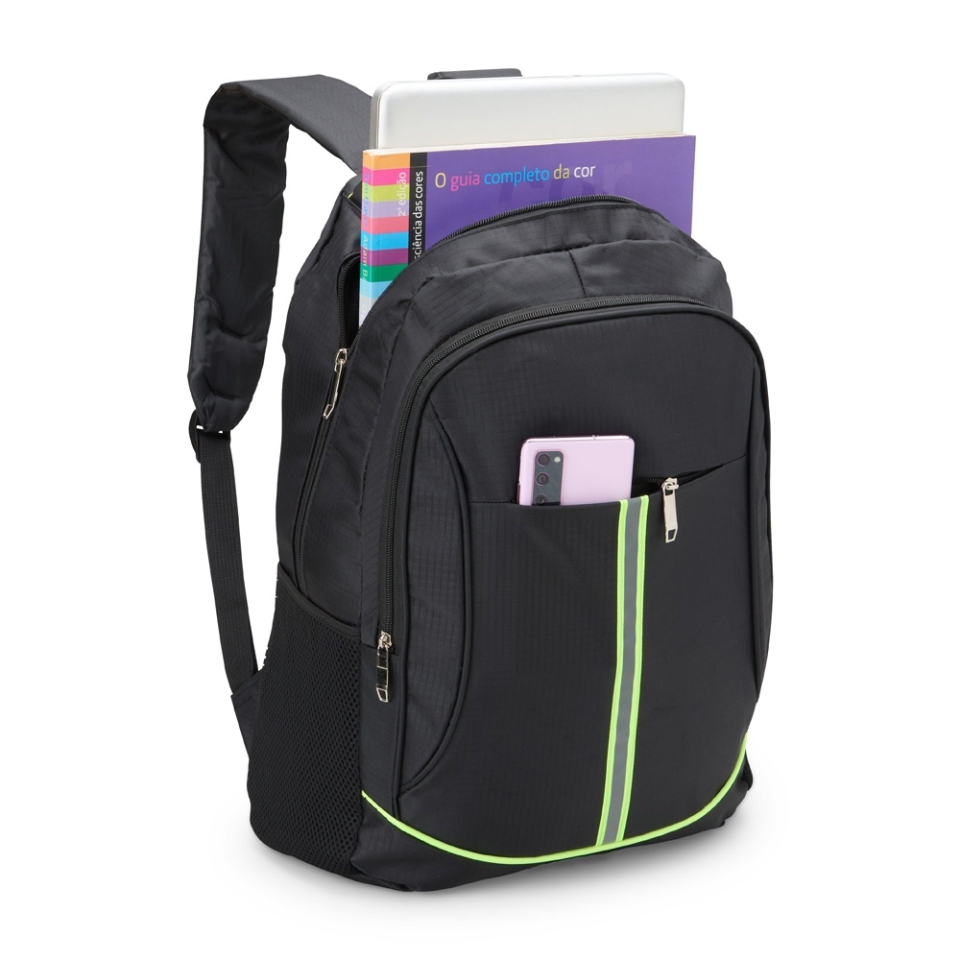 Mochila de nylon 30 Litros com três compartimentos, sendo o principal com bolso para notebook de 15,6. A mochila possui bolsos laterais em malha e faixa reflexiva na parte frontal.