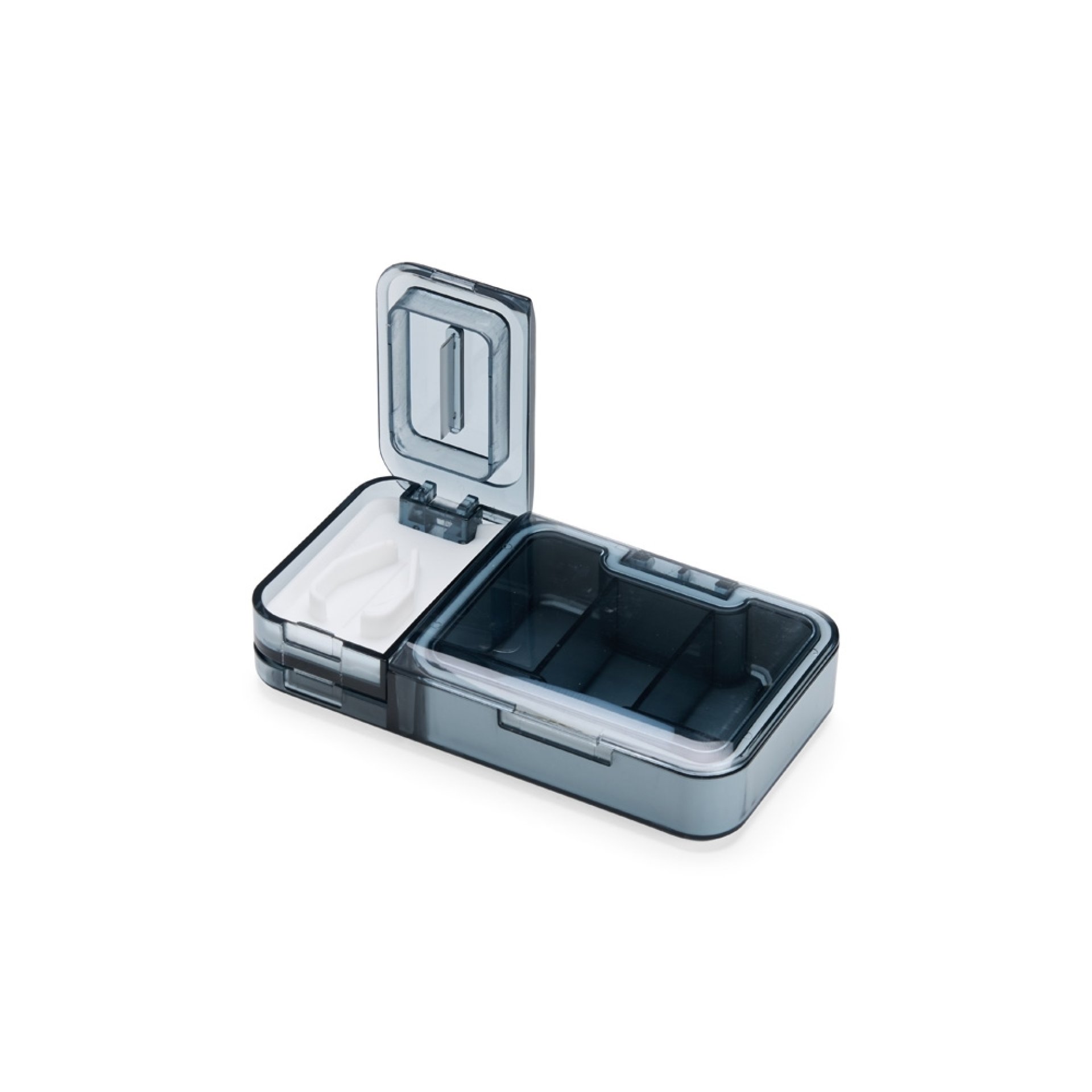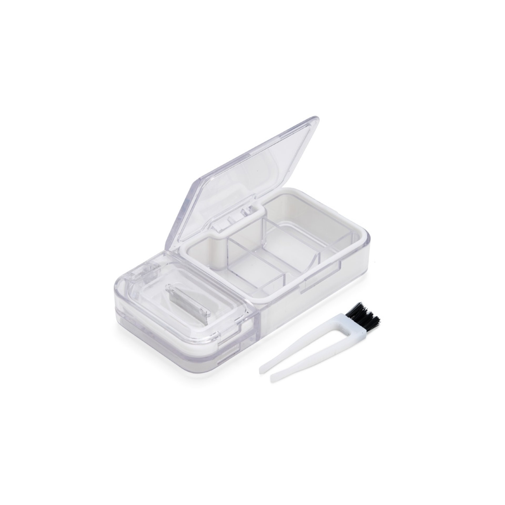 Um porta comprimidos multifuncional sob medida para as necessidades diárias de uma rotina de medicação. Feita em plástico, conta com três compartimentos principais, um com três divisórias com capacidade aproximada de 10 ml cada. As outras duas repartições, por sua vez, apresentam um cortador de comprimidos na parte superior e um triturador localizado na interior, ambos com acionamento manual prático e rápido. Seu tamanho compacto garante praticidade para levar o porta comprimidos para qualquer lugar. Acompanha uma pinça com ponta de escova para a limpeza.