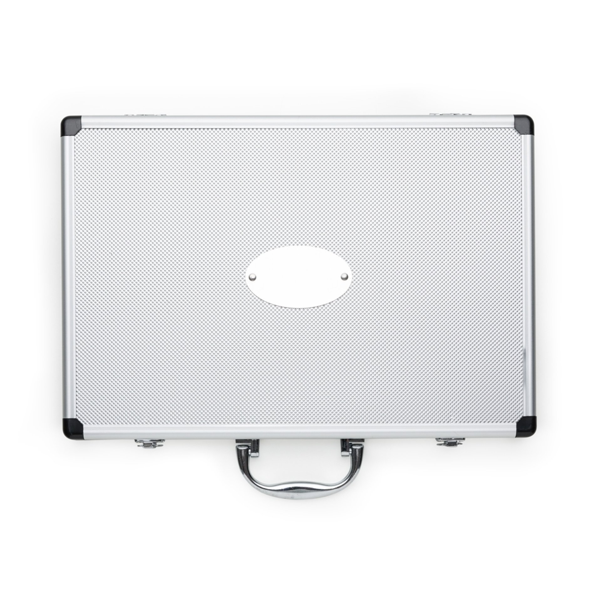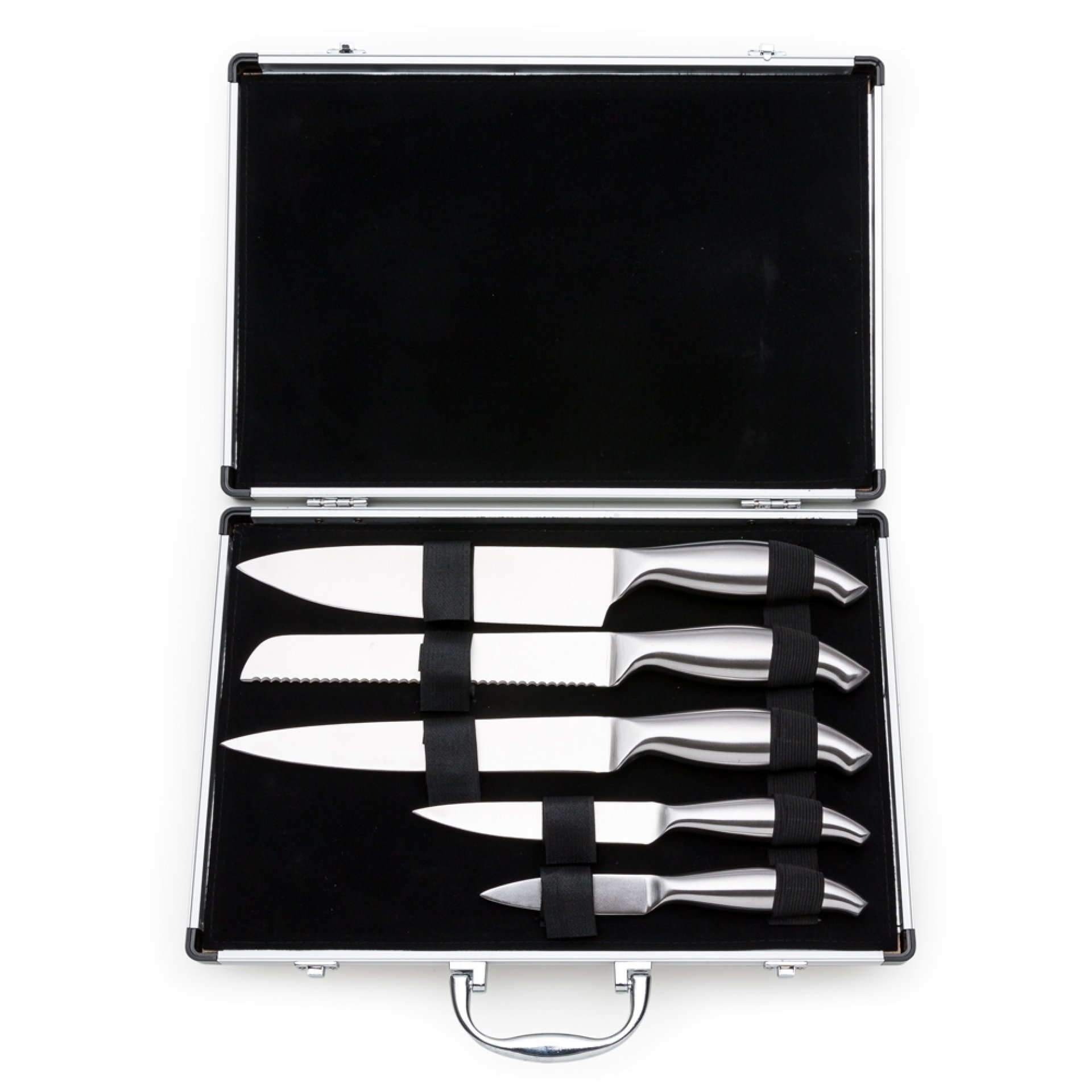 Kit Facas 5 peças em maleta de alumínio texturizado com placa central para personalização. Possui cinco facas(com proteção plástica) inteiras inox em tamanhos diferentes, parte interna da maleta revestida com veludo e possui também elásticos para fixar as peças. Parte externa da maleta possui uma alça e bordas plásticas pretas, duas dobradiças inferiores e parte superior com duas travas.
