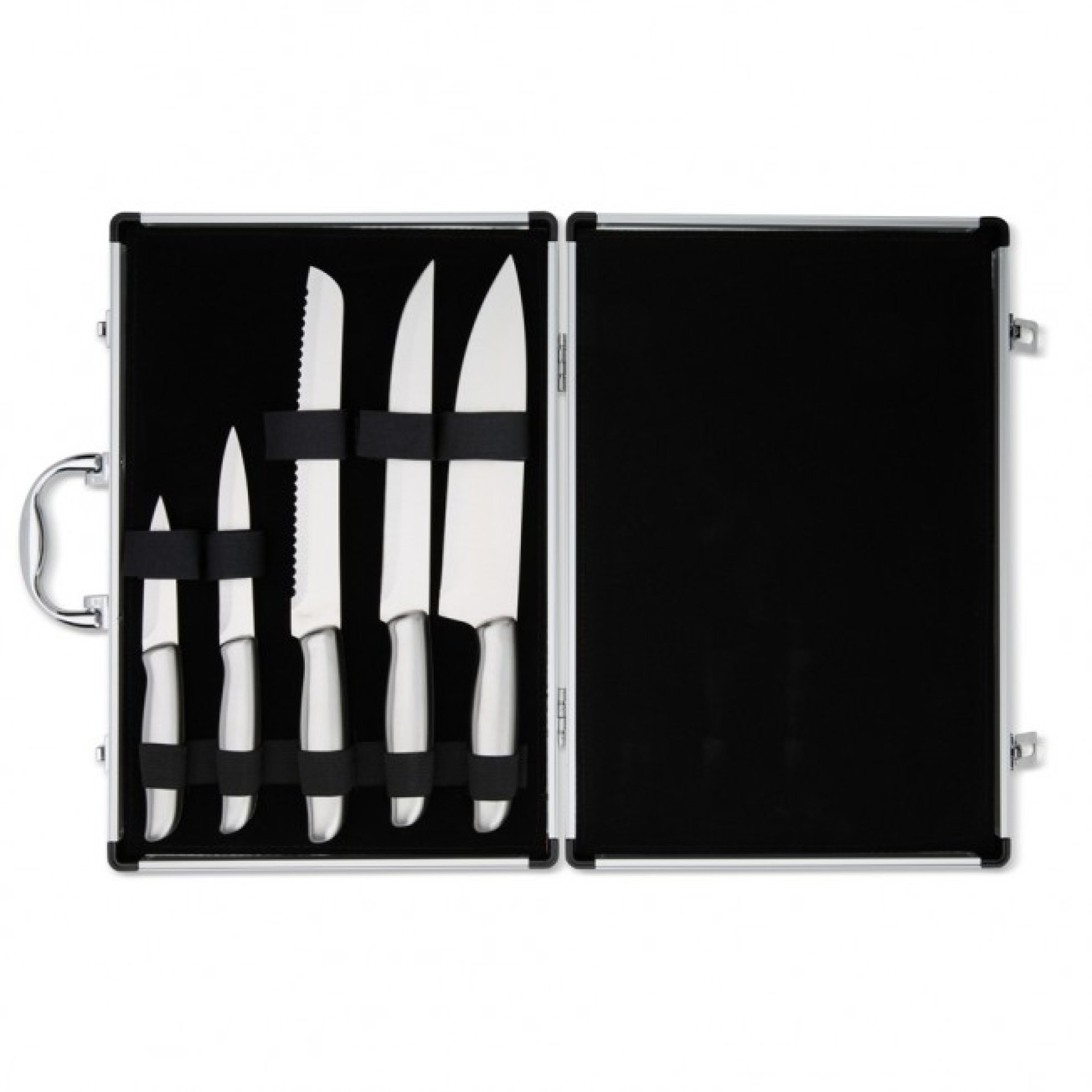A solução ideal para quem valoriza qualidade nos cortes e organização na cozinha. O kit inclui 5 facas em aço inoxidável, com diferentes tamanhos, perfeitas para uma experiência gourmet. Acompanha uma maleta de alumínio texturizado, com interior revestido de veludo e duas travas que garantem maior segurança. Além disso, a maleta oferece espaço para personalização, tornando o kit ainda mais exclusivo.