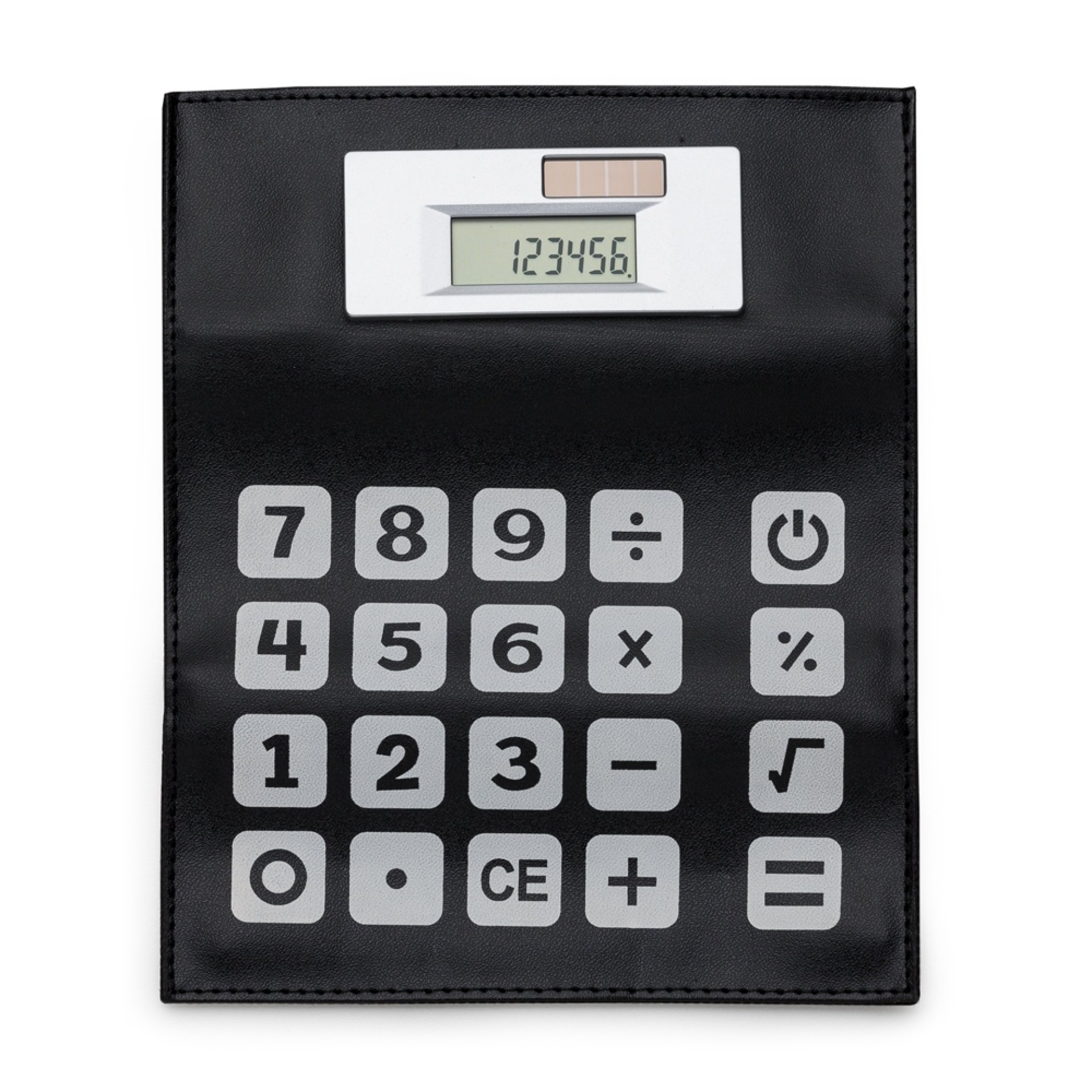 Mouse pad com calculadora solar de 8 dígitos em couro sintético. Mouse pad em couro sintético liso impresso número da calculadora em branco, parte traseira revestida em tnt, acompanha uma bateria AG10.