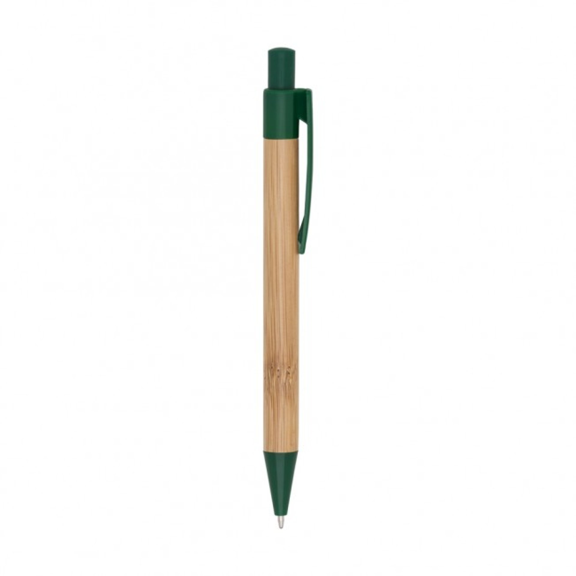 Caneta de bambu com detalhes plásticos, carga esferográfica azul e acionamento por clique.