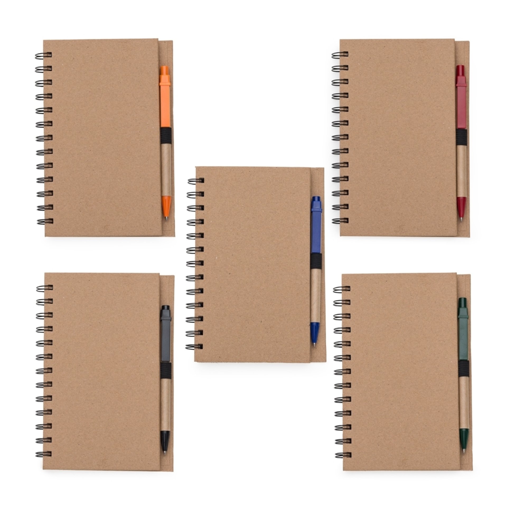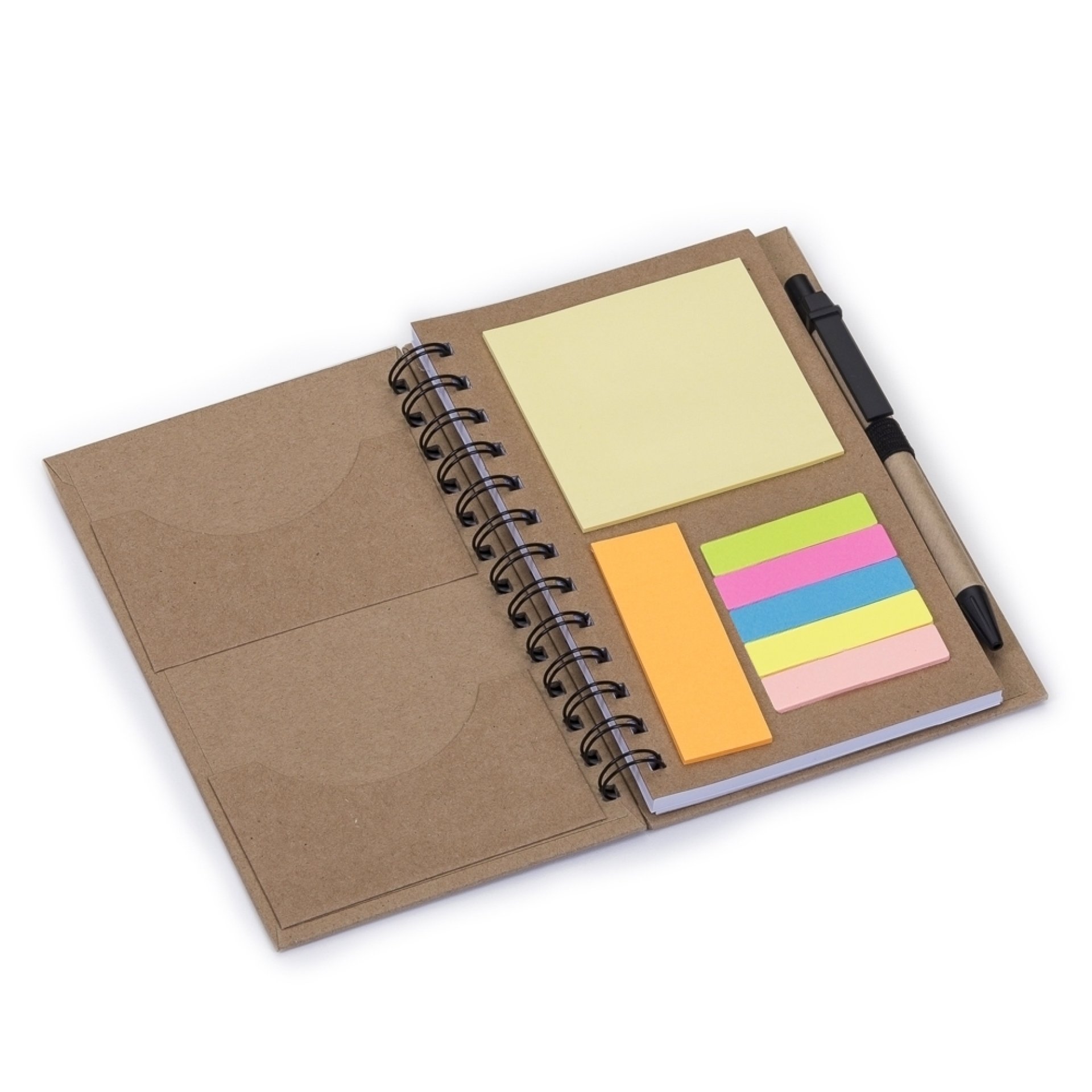 Caderneta ecológica com caneta e autoadesivos. Com dois suporte internos para cartão, possui cinco blocos autoadesivos com 20 folhas cada, bloco laranja e bloco amarelo com aproximadamente 20 folhas cada. Possui aproximadamente 70 folhas brancas pautadas e caneta de papelão de clip e ponteira plástica.