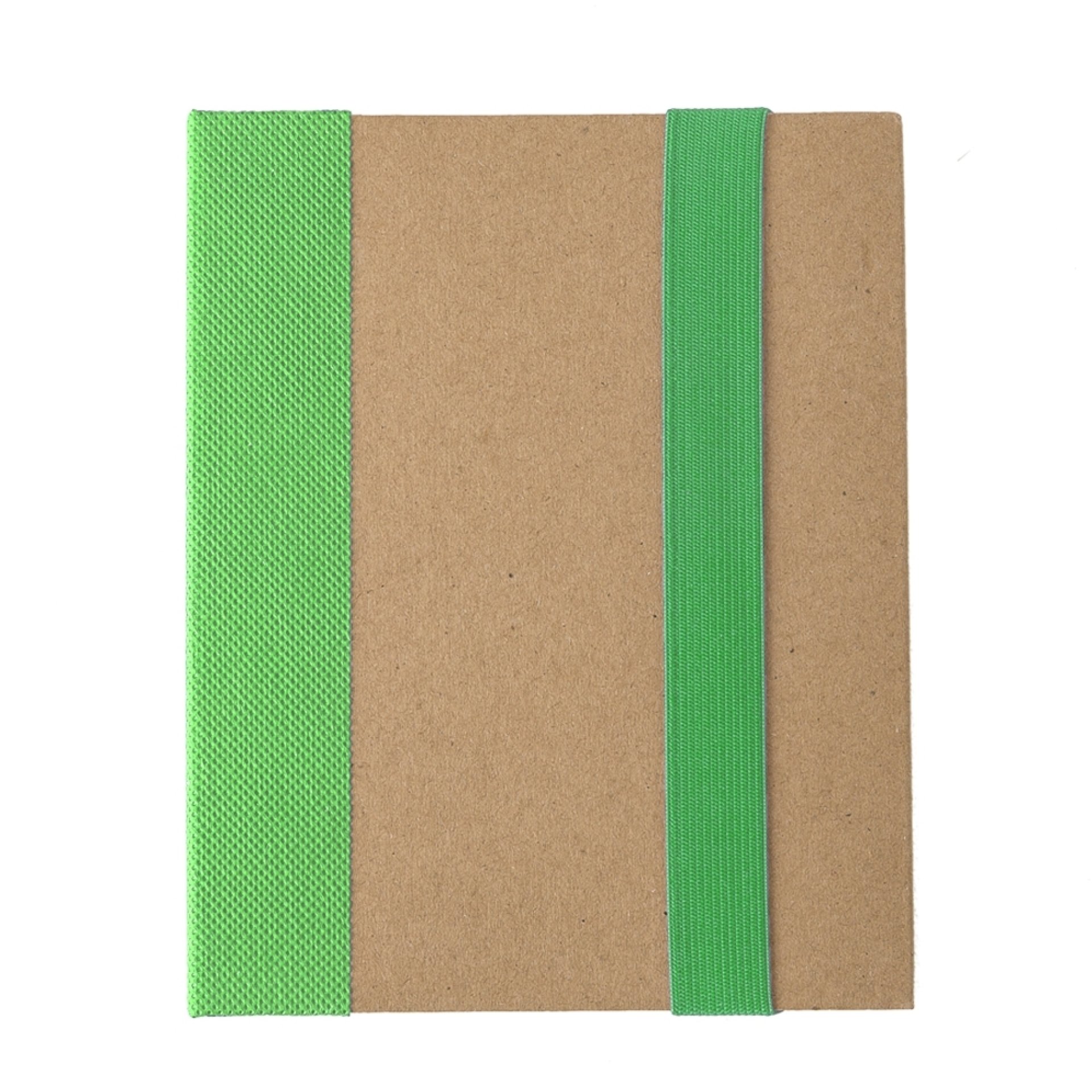 Bloco de anotações ecológico com caneta e autoadesivos, material kraft. Possui uma faixa colorida em tnt e fita elástica, parte interna com suporte para caneta de papelão com clip plástico; bloco amarelo médio com aproximadamente 20 folhas; bloco amarelo pequeno com aproximadamente 20 folhas; cinco blocos autoadesivos coloridos com aproximadamente 20 folhas cada e bloco de folhas pardas com aproximadamente 70 folhas.