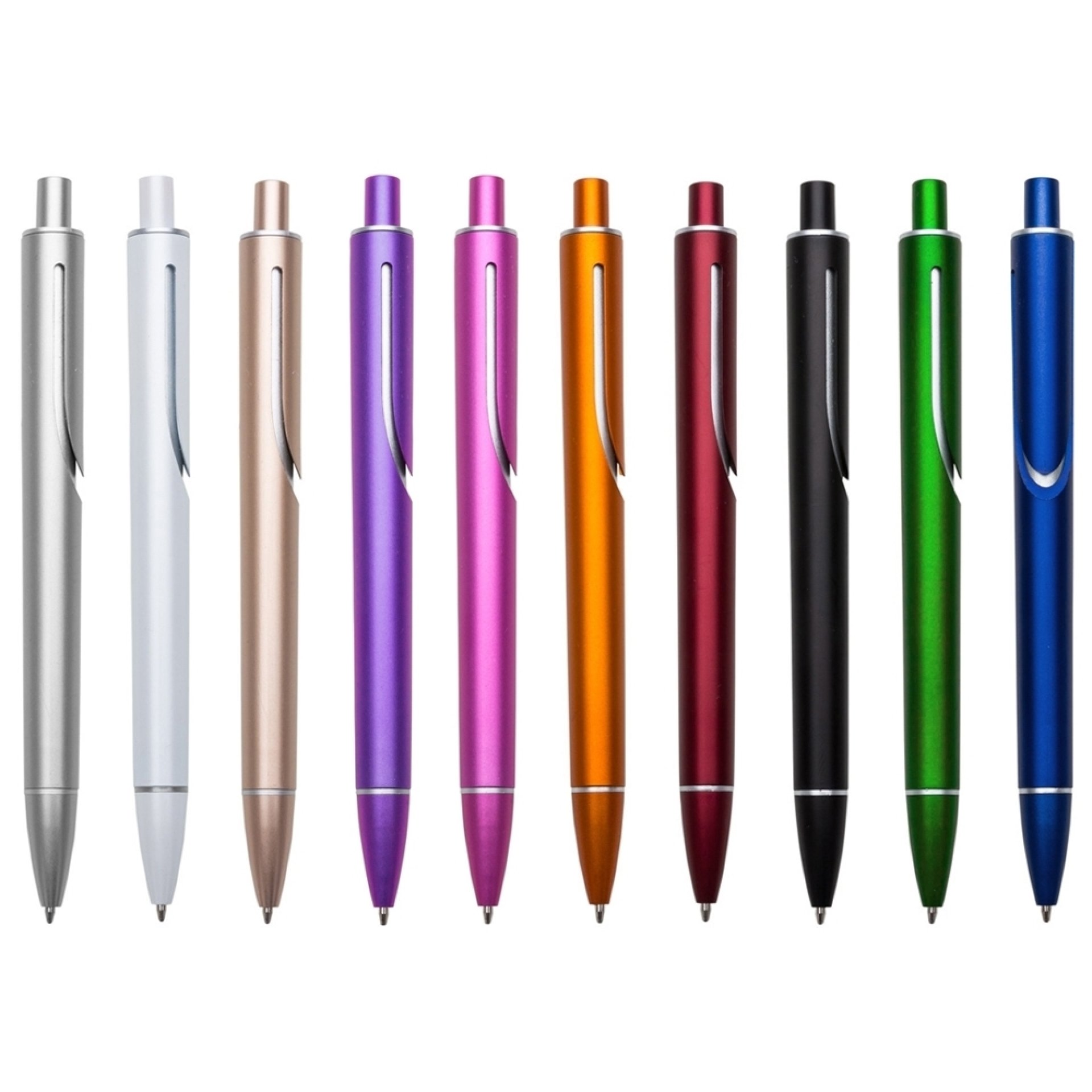 Caneta plástica com carga esferográfica azul e acionamento por clique.