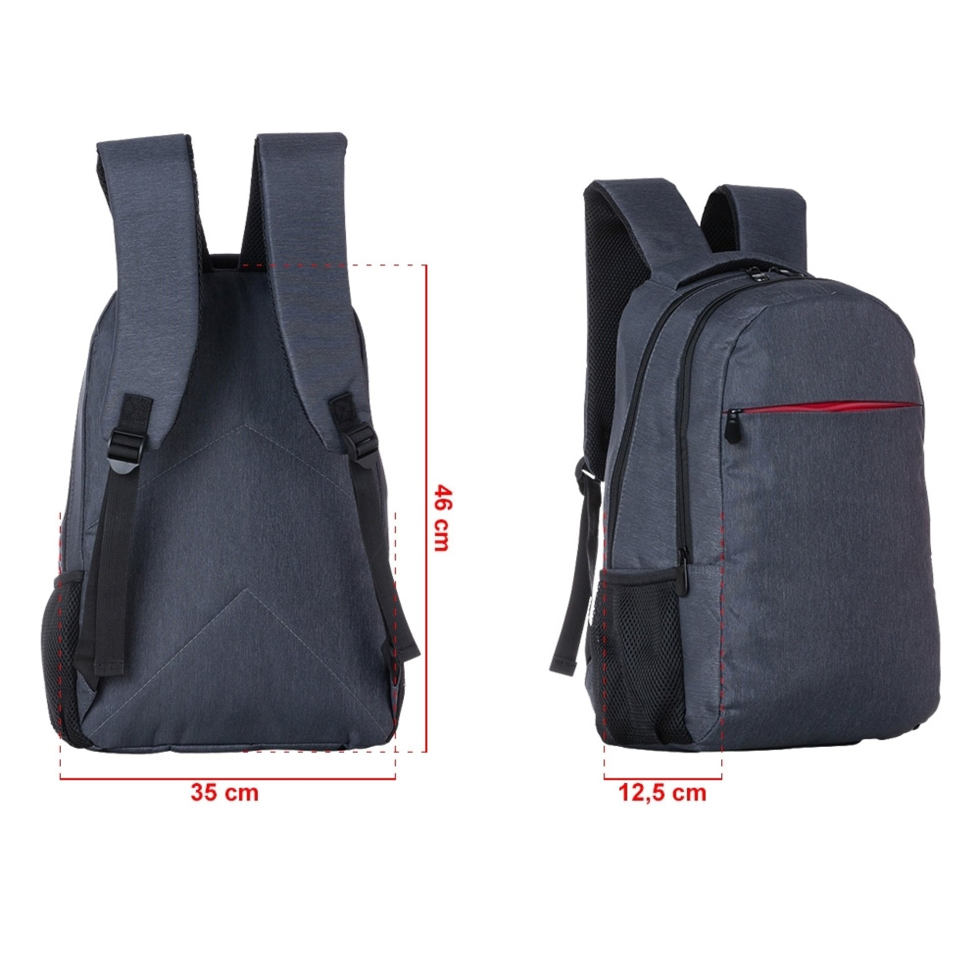 Mochila confeccionada em poliéster com compartimento para notebook até 15,6 polegadas. Contém compartimento grande, compartimento mediano com divisórias e bolso telado, compartimento frontal e bolsos laterais em malha. Alça de mão com revestimento espumado, alças para as costas ajustáveis e com revestimento espumado.