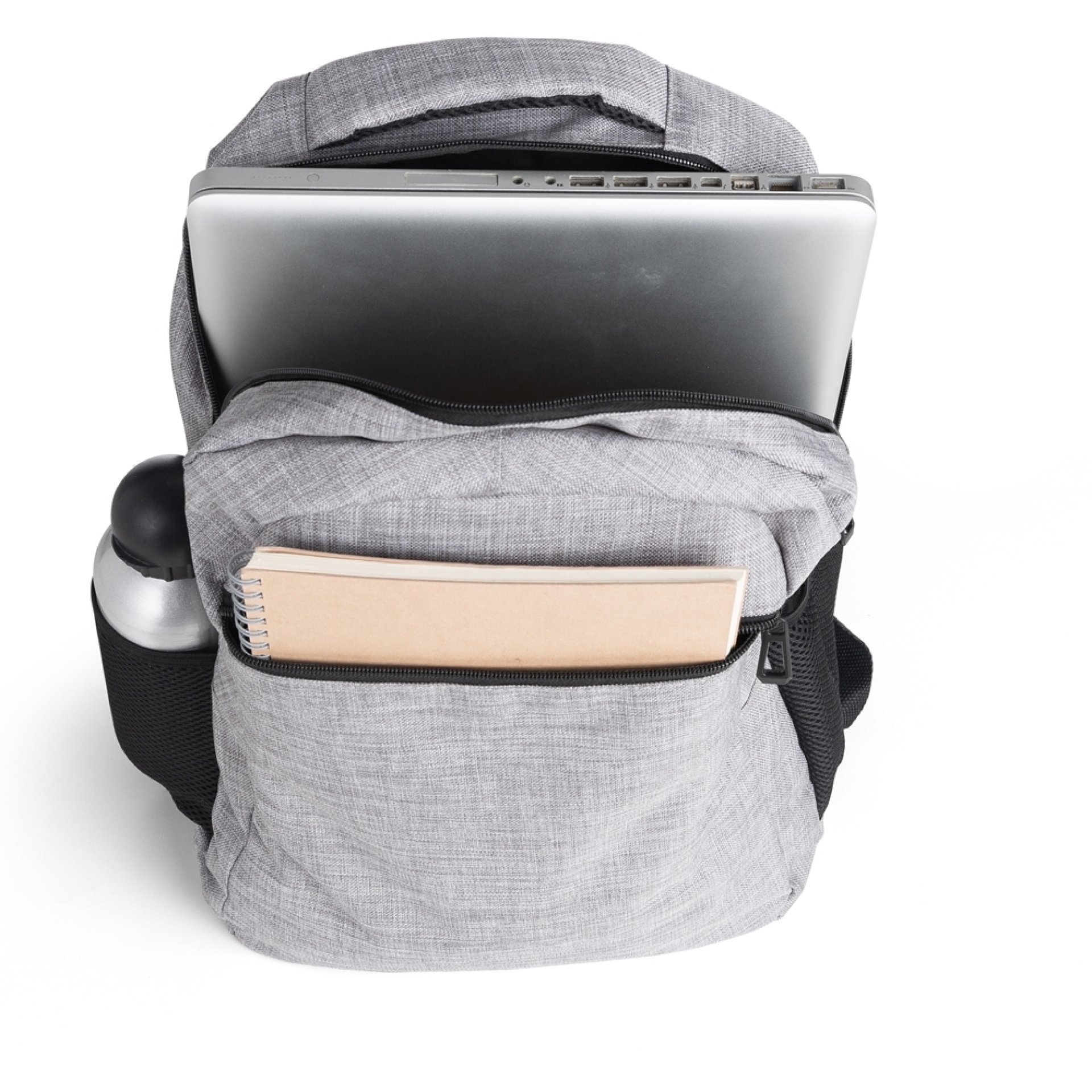 Mochila confeccionada em poliéster com compartimento para notebook até 15,6 polegadas. Contém um compartimento grande, compartimento frontal e bolsos laterais em malha. Alça de mão com revestimento espumado e alças para as costas ajustáveis.