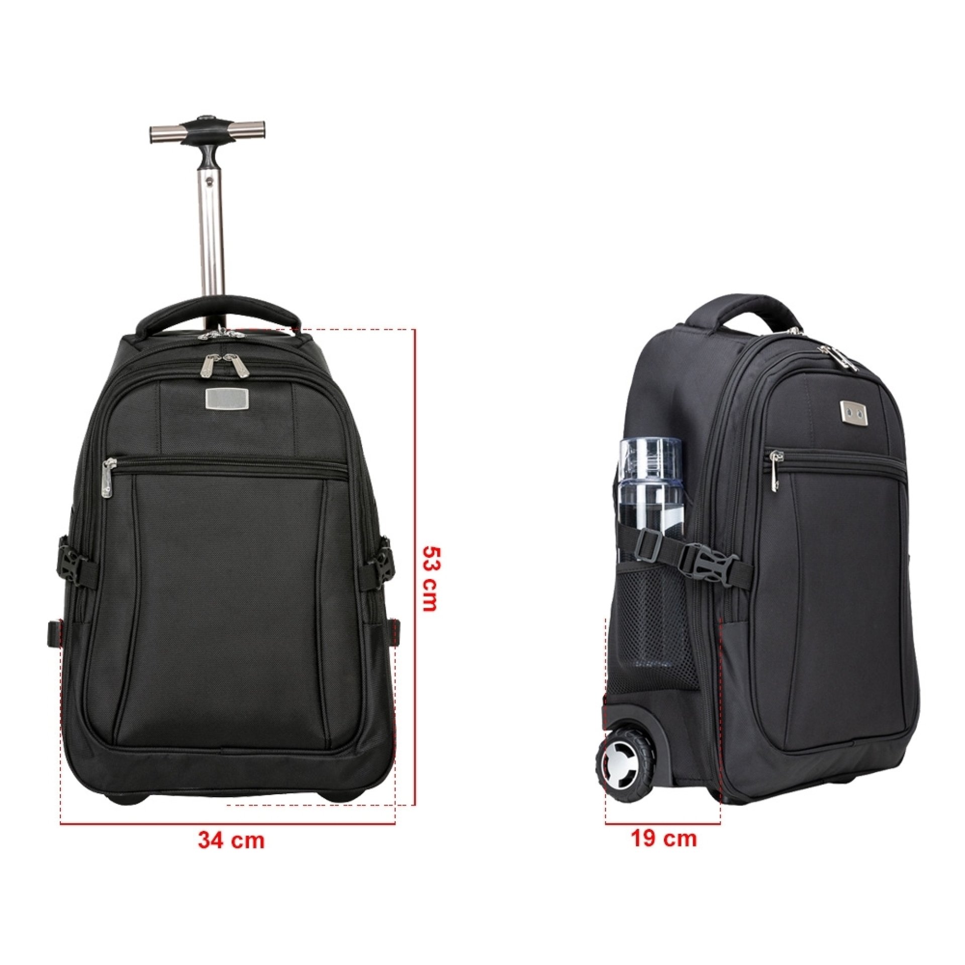 Mochila de carrinho confeccionada em nylon, contém puxador retrátil de alumínio com botão acionador, alça de mão com revestimento espumado, alças para as costas reguláveis com revestimento espumado e fivelas para regulagem peitoral, fivelas laterais para compressão, rodinhas e freios em pvc. Compartimento principal com porta notebook (até 14 polegadas), suporte USB com cabo acoplado para saída externa, fita compressora para vestuário, fechos laterais internos com velcro e fundo com placa de pvc; compartimento traseiro para retenção das alças de costas com “liga” de velcro e “capas” embutidas para as rodinhas; compartimento mediado com divisória em tela; compartimento frontal e bolsos laterais de malha. Acompanha plaquinha metálica imantada.