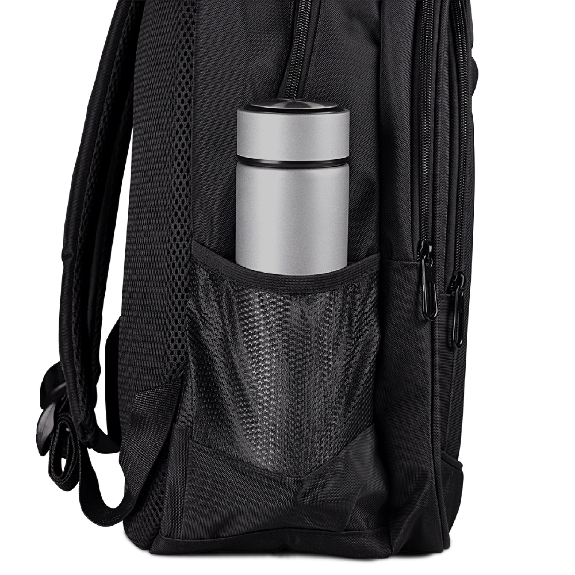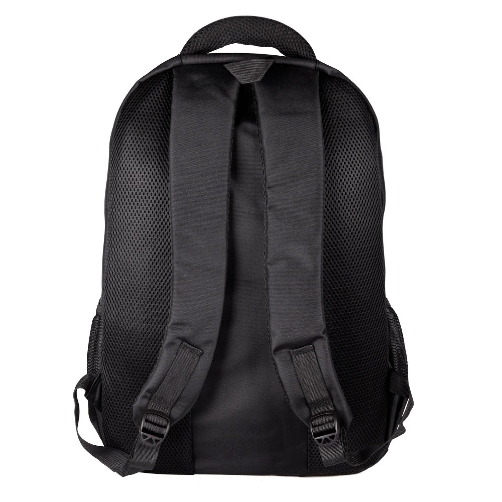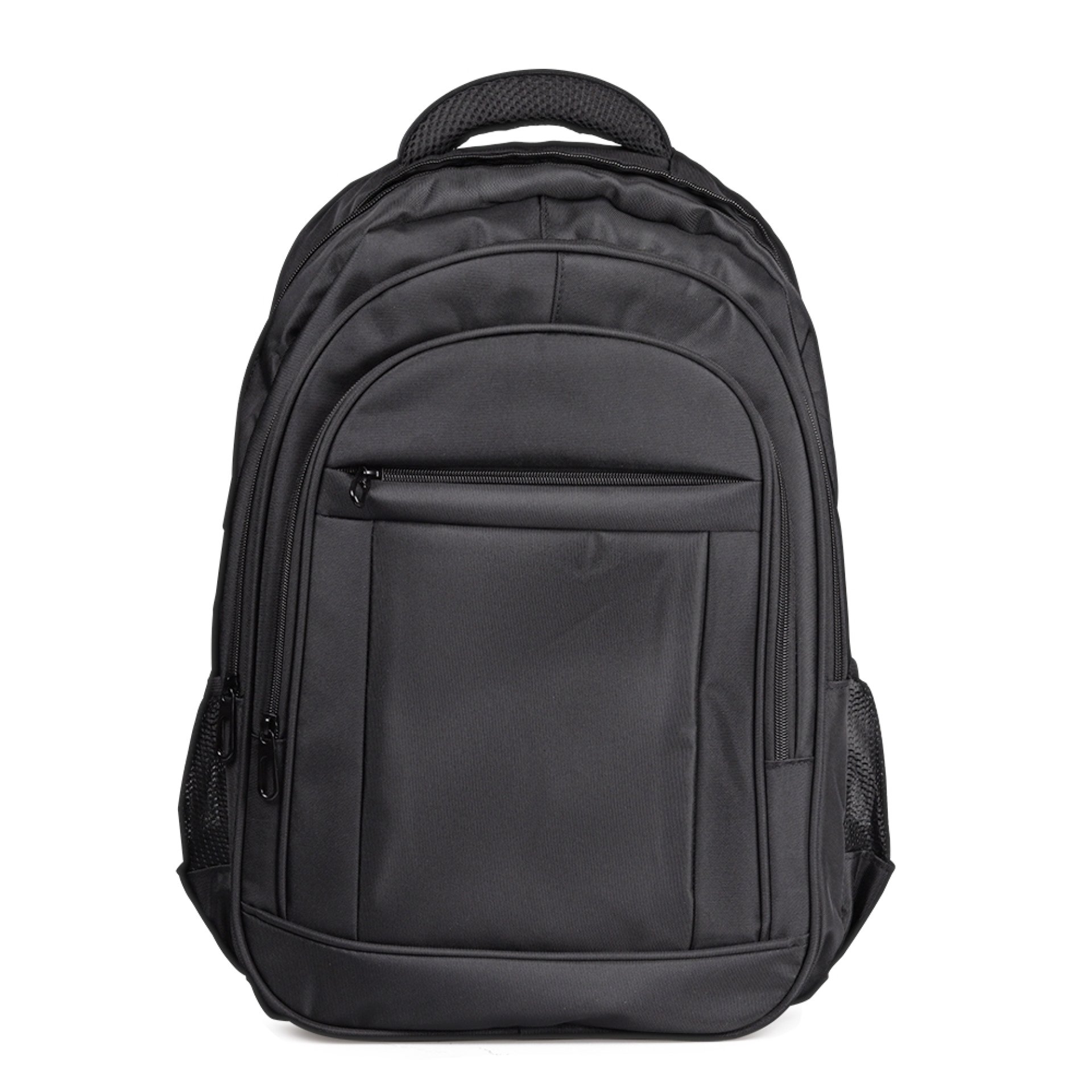 Mochila confeccionada em poliéster com compartimento para notebook. Contém compartimento grande com bolso para notebook até 17 polegadas, compartimento mediano com zíper, compartimento pequeno com zíper bolso frontal com zíper, alça de mão, alça superior em nylon, alças de ombro e costas acolchoada com revestimento antitranspirante e bolsos laterais telados.
