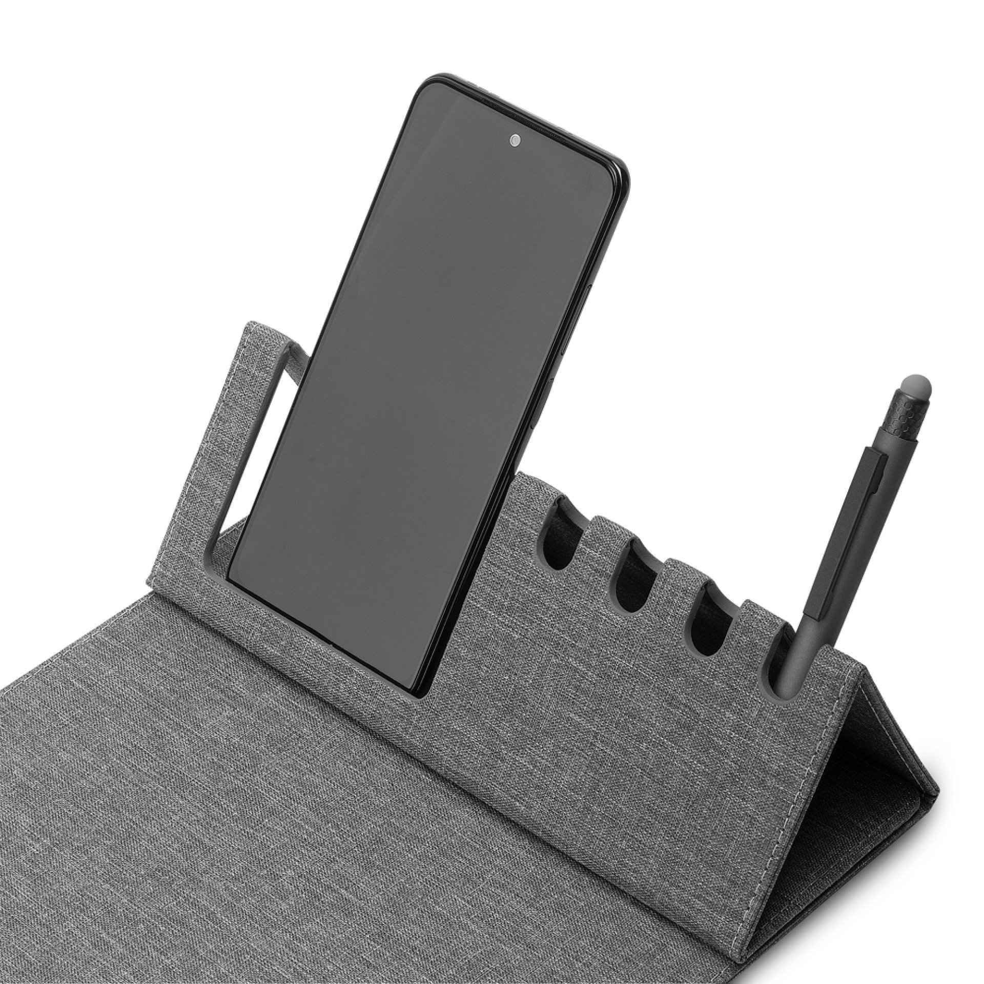 Mouse pad em material RPET (PET Reciclado) com suporte para celular e canetas.