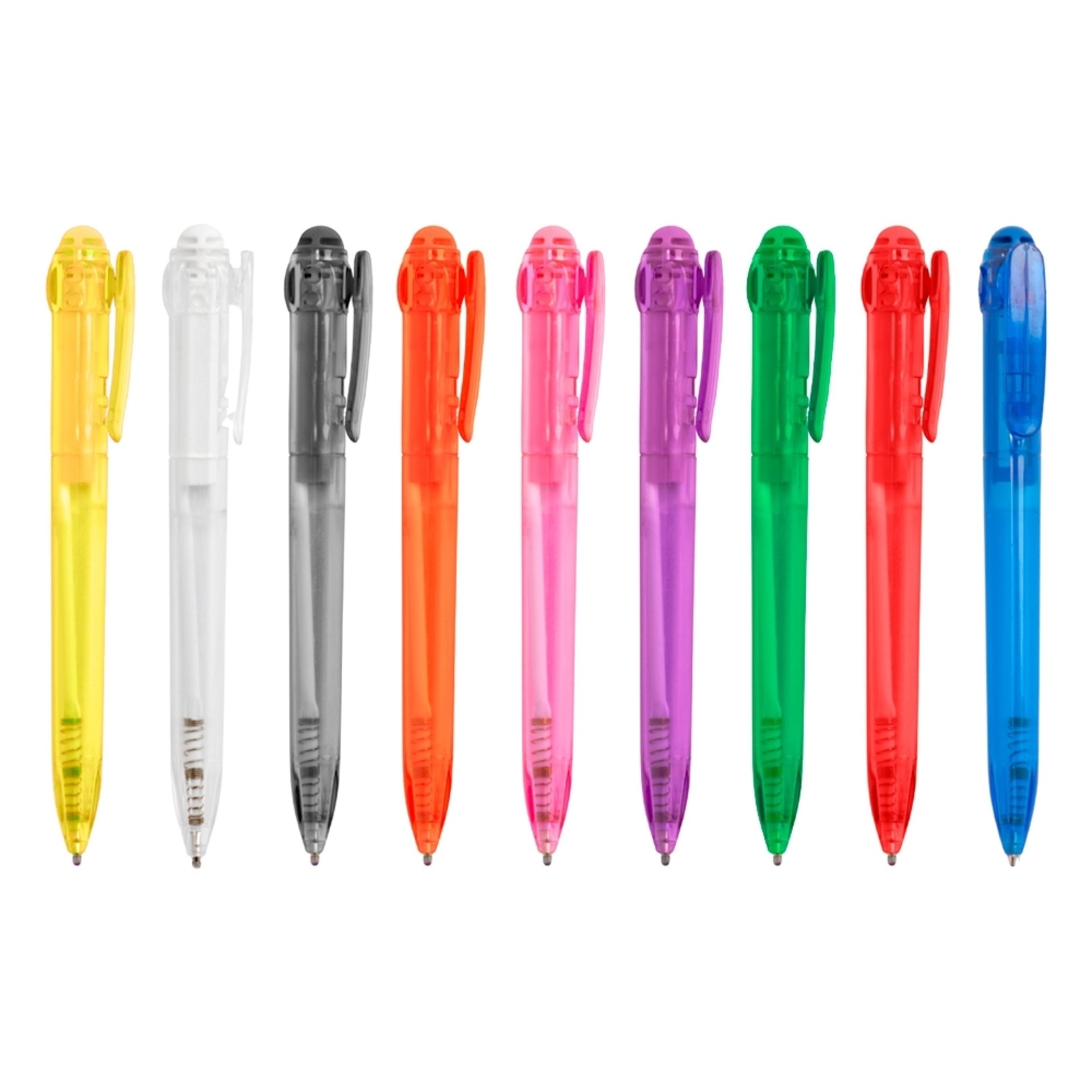 Caneta plástica com carga esferográfica azul 1.0mm, acionamento por clique.